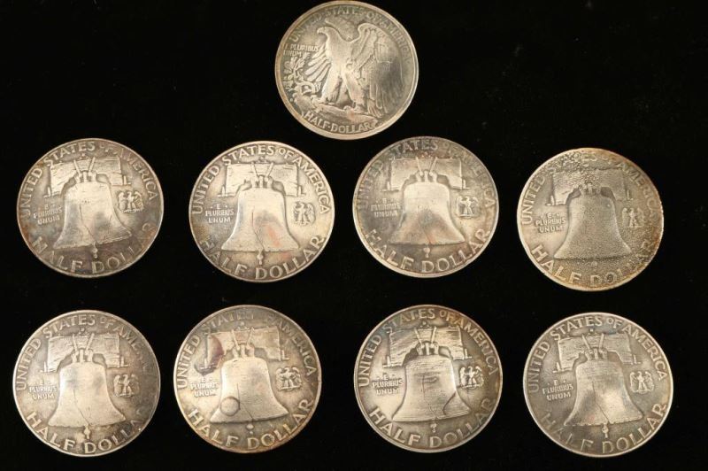 (1) 1943 Walking Liberty Half Dollar button and (8) Ben Franklin Half Dollars from 1957 to 1962 all made into domed buttons with a single loop shank. Displayed in a small Riker mount. Each measures 1 1/8" in dia.