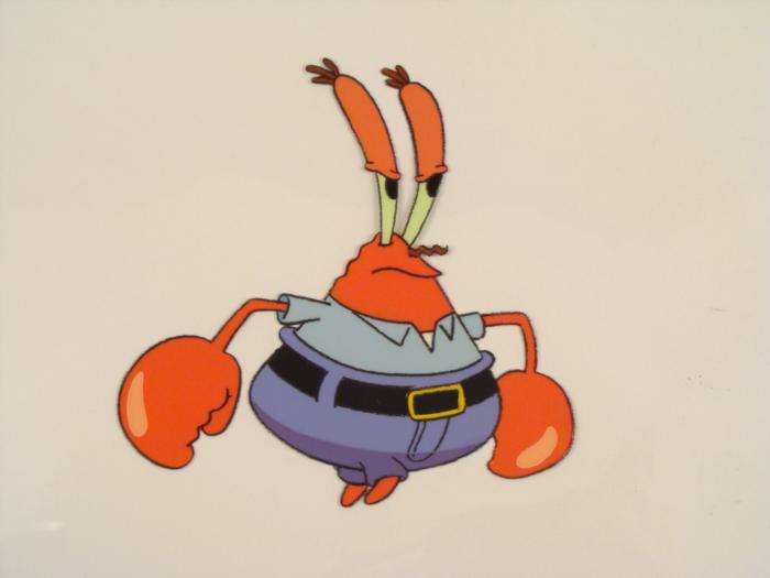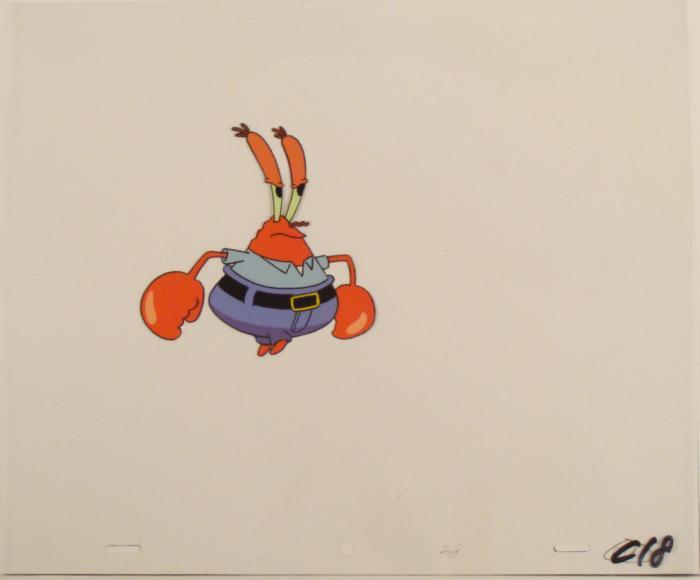 This original animation cel is from the Nickelodeon TV show SpongeBob Squarepants.  The story takes place under the deep blue sea in Bikini Bottom, where SpongeBob resides. SpongeBob, who is a yellow, porous sponge, is your typical happy-go-lucky character, as he is always cheerful and enjoys making people laugh. Patrick Star, SpongeBob's neighbor who is a starfish, is your average children's show idiot, as he boasts knowing nothing and is often getting himself into ridiculous situations. Between the homes of these two lies the home of the miserable Squidward, a squid, who is known for being grouchy and playing tricks on SpongeBob and Patrick. Both SpongeBob and Squidward work at the Krusty Krab, a fast food business run by the greedy money-loving Mr. Krabs, a crab, the arch rival of the evil, possibly misunderstood, Plankton. Another neighbor, Sandy Cheeks, an athletic squirrel who normally wears an astronaut's space suit, was introduced in "Tea at the Treedome." She spends most of her time inventing and experimenting.  Mr. Krabs is walkingOriginal Production Animated Cel Overall Size of Cel: 10 1/2" x 12 1/2"  Very Good ConditionThis is an original hand-painted cel set-up used in the production of an episode of "SpongeBob SquarePants." Each one-of-a-kind set-up represents a slight change in position of the characters. When individually photographed and projected in rapid succession, the images appear to move.