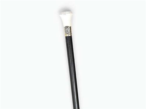 Ebony with turned ivory handle, coat of arms on the gilt metal ring. The handle is slightly damaged. Length: 81.5 cm