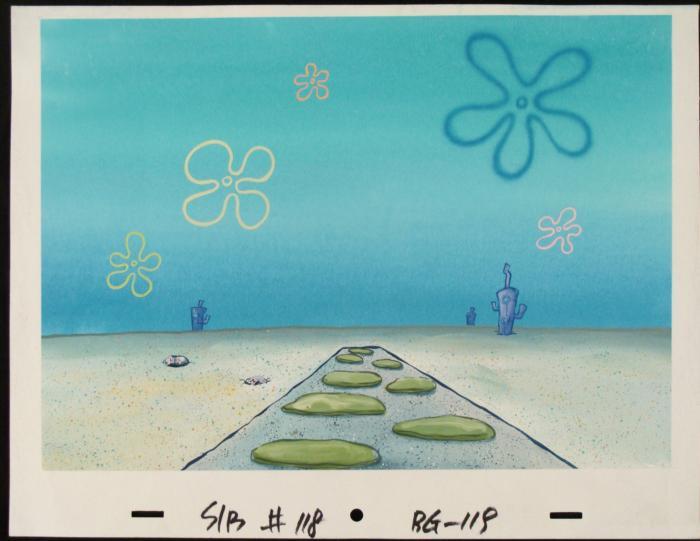 This original hand-painted background from the Nickelodeon TV show SpongeBob Squarepants. The story takes place under the deep blue sea in Bikini Bottom, where SpongeBob resides. SpongeBob, who is a yellow, porous sponge, is your typical happy-go-lucky character, as he is always cheerful and enjoys making people laugh. Patrick Star, SpongeBob's neighbor who is a starfish, is your average children's show idiot, as he boasts knowing nothing and is often getting himself into ridiculous situations. Between the homes of these two lies the home of the miserable Squidward, a squid, who is known for being grouchy and playing tricks on SpongeBob and Patrick. Both SpongeBob and Squidward work at the Krusty Krab, a fast food business run by the greedy money-loving Mr. Krabs, a crab, the arch rival of the evil, possibly misunderstood, Plankton. Another neighbor, Sandy Cheeks, an athletic squirrel who normally wears an astronaut's space suit, was introduced in "Tea at the Treedome." She spends most of her time inventing and experimenting. It's a walkway to nowhereOriginal Production Background Overall Size of Background: 10" x 13" Very good conditionOriginal Production Backgrounds are used in the making of the final version of animated productions. The background establishes the location and the overall good mood of the scenee. Typically, a background layout artist creates a drawing to establish the content of the scene, placement of characters, perspective and camera angle. Based on this drawing, the background artist creates a preliminary painting to confirm all of the scenes details, then the final production background which is used in the filming of the scene. When these backgrounds are individually photographed behind the progression of production cels, and projected at a rapid succession, the images in the foreground appear to move, creating an animated scene. The background is ready to be matted and framed. It is a colored background with the animator's notations at the bottom.