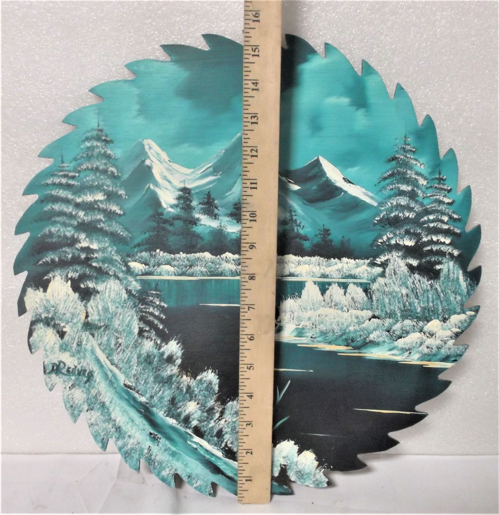 Note: this is painted on wood which has been cut to look like a saw blade. This is not on metal.