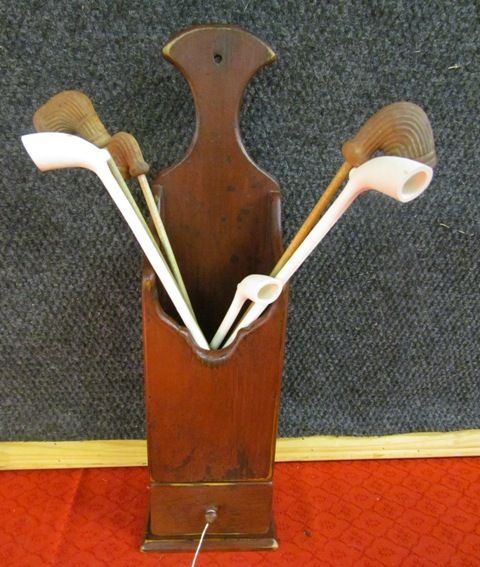 Wall Hanging Pipe Holder with Pipes and Match Drawer in original redish paint -18" t x 5" w