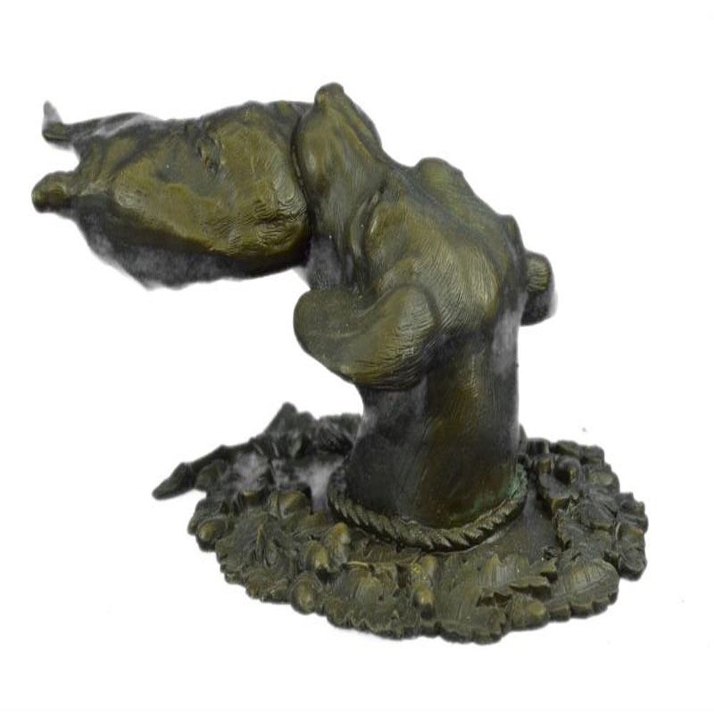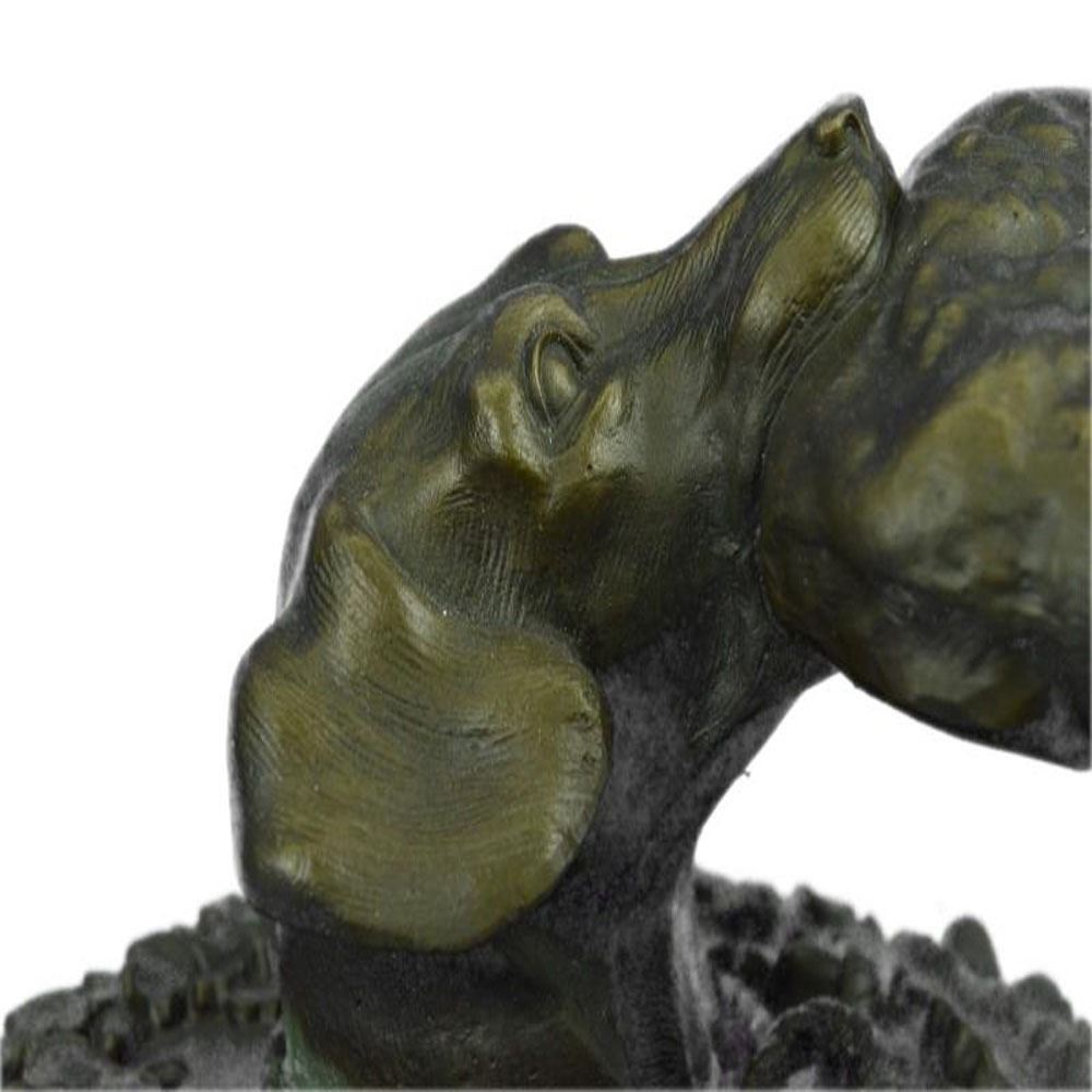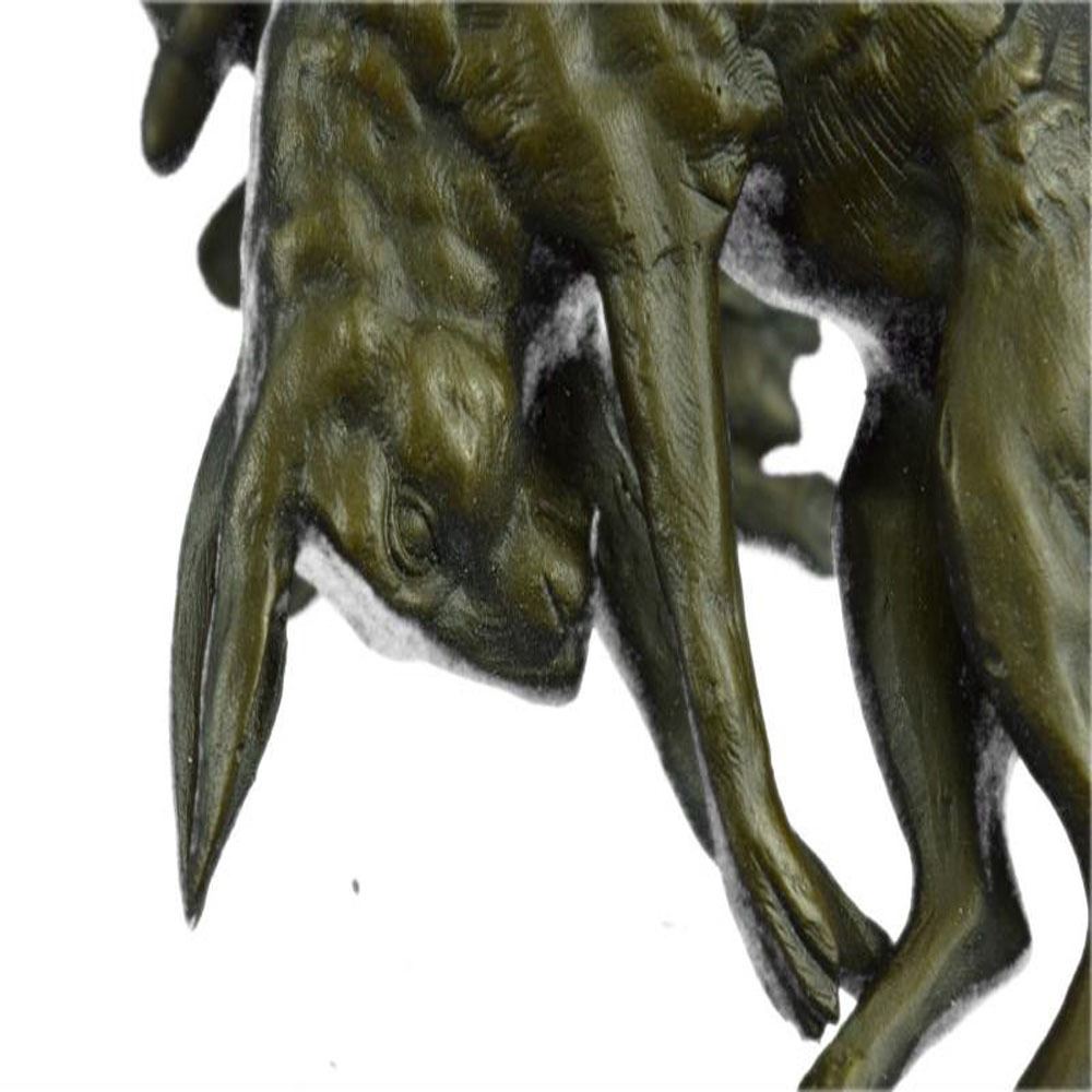 This Sculpture depicts a dog, possibly a hound, with a rabbit gripped in his mouth. The hound is slim and his ribs are pronounced. His tail wraps around him as he sits. His eyes gaze up to the right, likely looking at his owner with satisfaction over the effort it took to catch his prey. He still has a snarl over his mouth and you can see his teeth have a firm grip on the rabbit which lays limply by his waist. The piece has a rustic feel and has a two toned brown patina and can be mounted on wall. Bronze dimensions: Height 12 X width 7 inches. Weight: 7 LBS.