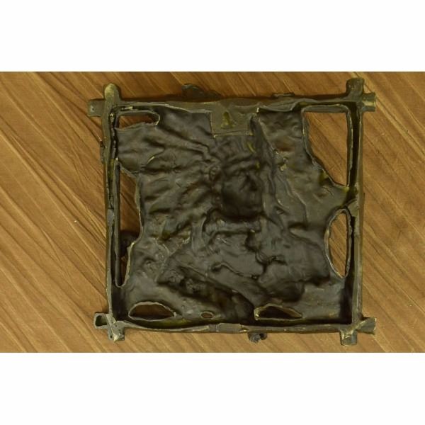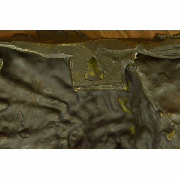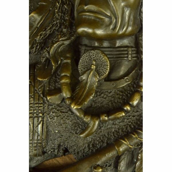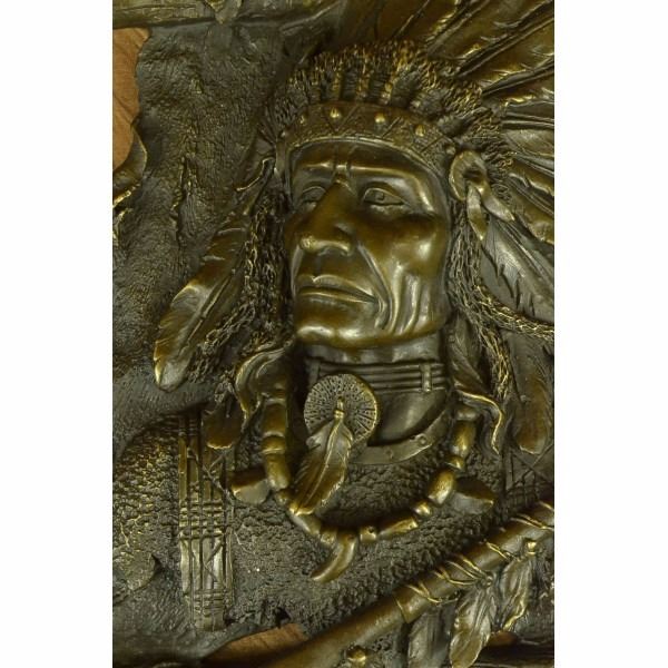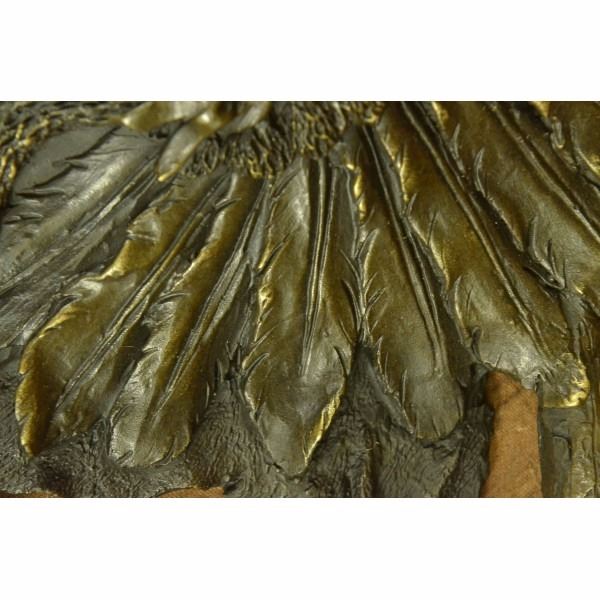 We LOVE this Native American Chief Wall Mount. So large, and full of detail in his braids, feathers and head. What a great conversation starter. Sits majestically on any wall.Made out of pure bronze and hand painted in a crisp, clean brown patina. We love the size in depth AND in total.He's heavy, so please use a very strong nail, or dry wall or plaster anchor. He's easy to hang. In the back, there is a key hole, so aim for the nail, and just place the key hole on it. Condition: This sculpture is in perfect condition. Bronze Dimensions :Height 10" x Width 11" Weight : 8 LBS Inventory : 25YRD11416152