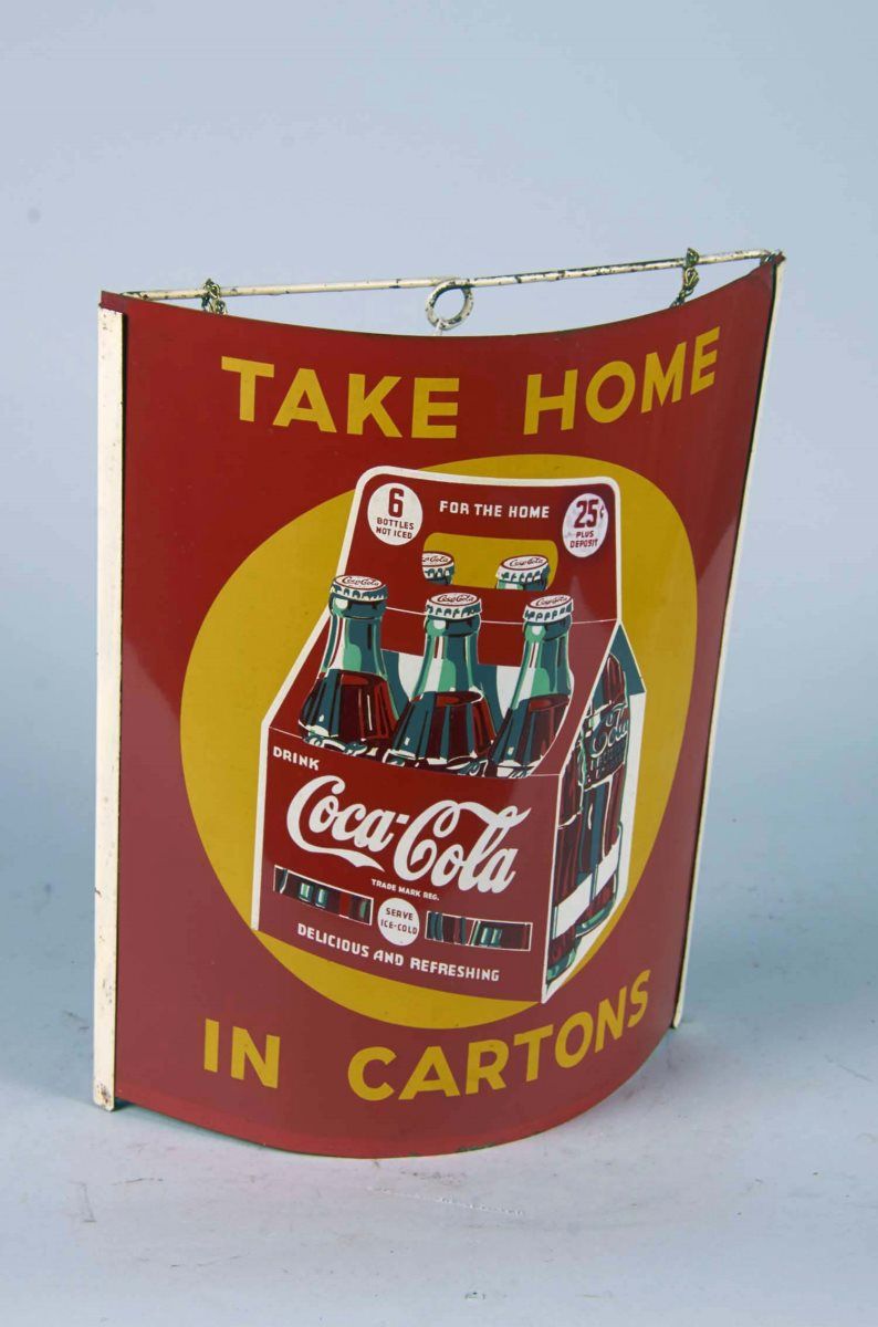 Single sided "Take Home In Cartons" Coke advertising string holder with curved front and spool of string, circa 1930's. Condition (Very good). Size 13" x 16" x 4"