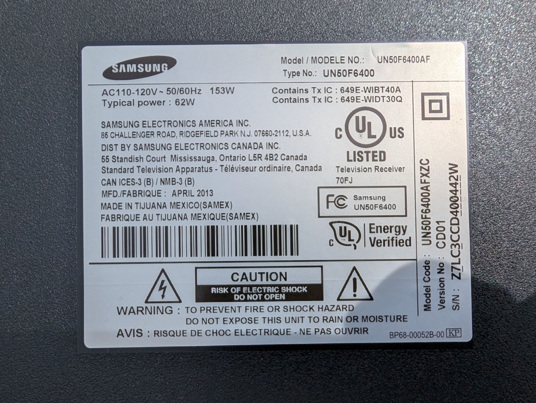Wall Mounted Samsung TV Model Code: UN50F6400AFXZC/ Model NO. UN50F6400AF AC110-120V ~50/60Hz 153W