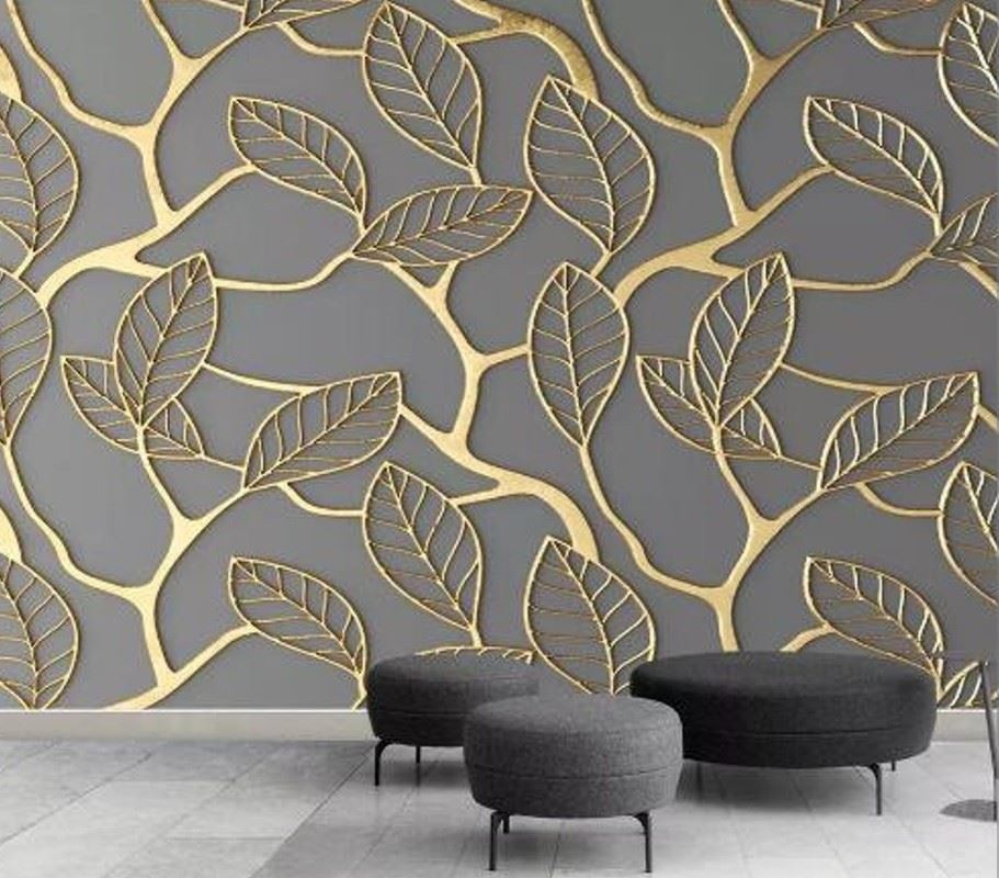 Elegant botanical wallpaper with metallic gold leaves on a grey background, ideal for feature walls, new.