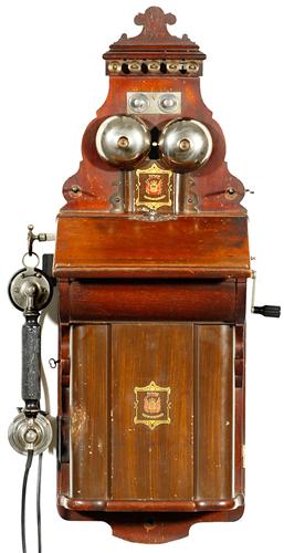 Wall Phone "Jydsk Telefon Aktieselskab", c. 1900 Wooden case with metal front, complete with all parts and handset.<Br>