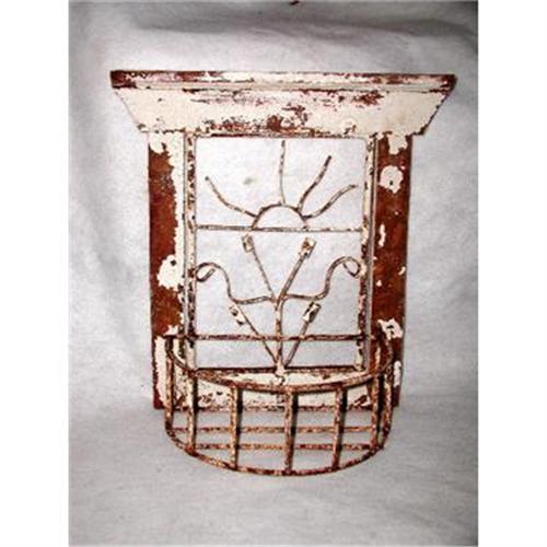 French wooden framed plant holder has iron semi circular basket below 7D X 11.25 with two iron support rods on the bottom for holding plants. Iron work design in the back "window" with one small missing spoke. The rustic wooden frame with aged white paint could have a hanger attached for hanging,yet sits level if for table top use. Measures 17L X 9.5D X 18H. Sure to make any plant or combination special.