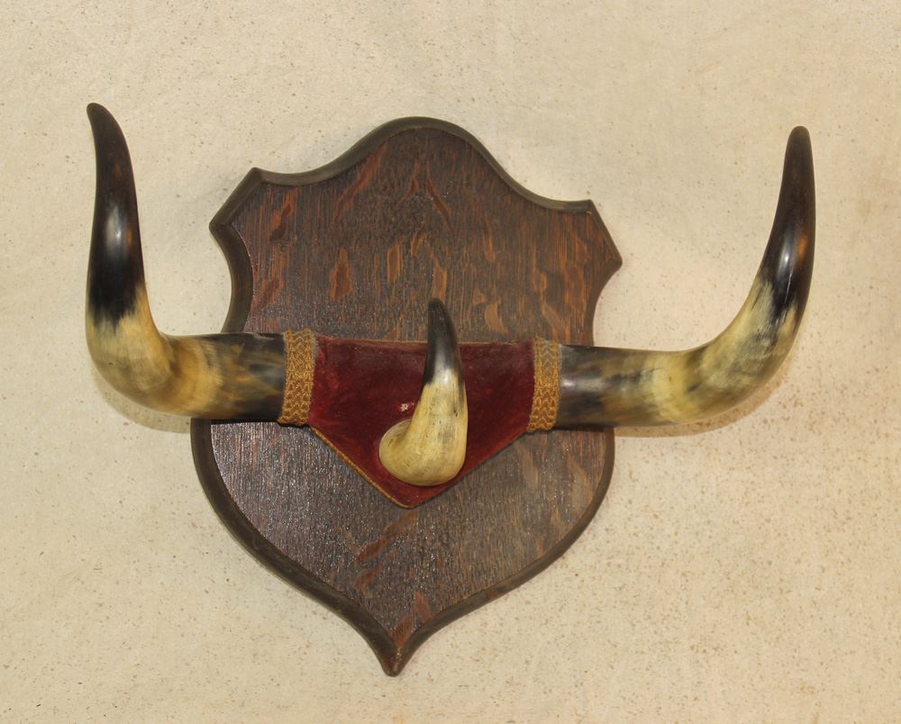 A great looking early longhorn rack mounted on an original quartersawn oak plaque in the shape of a shield. Measuring 16" wide. Tony Baratono collection.