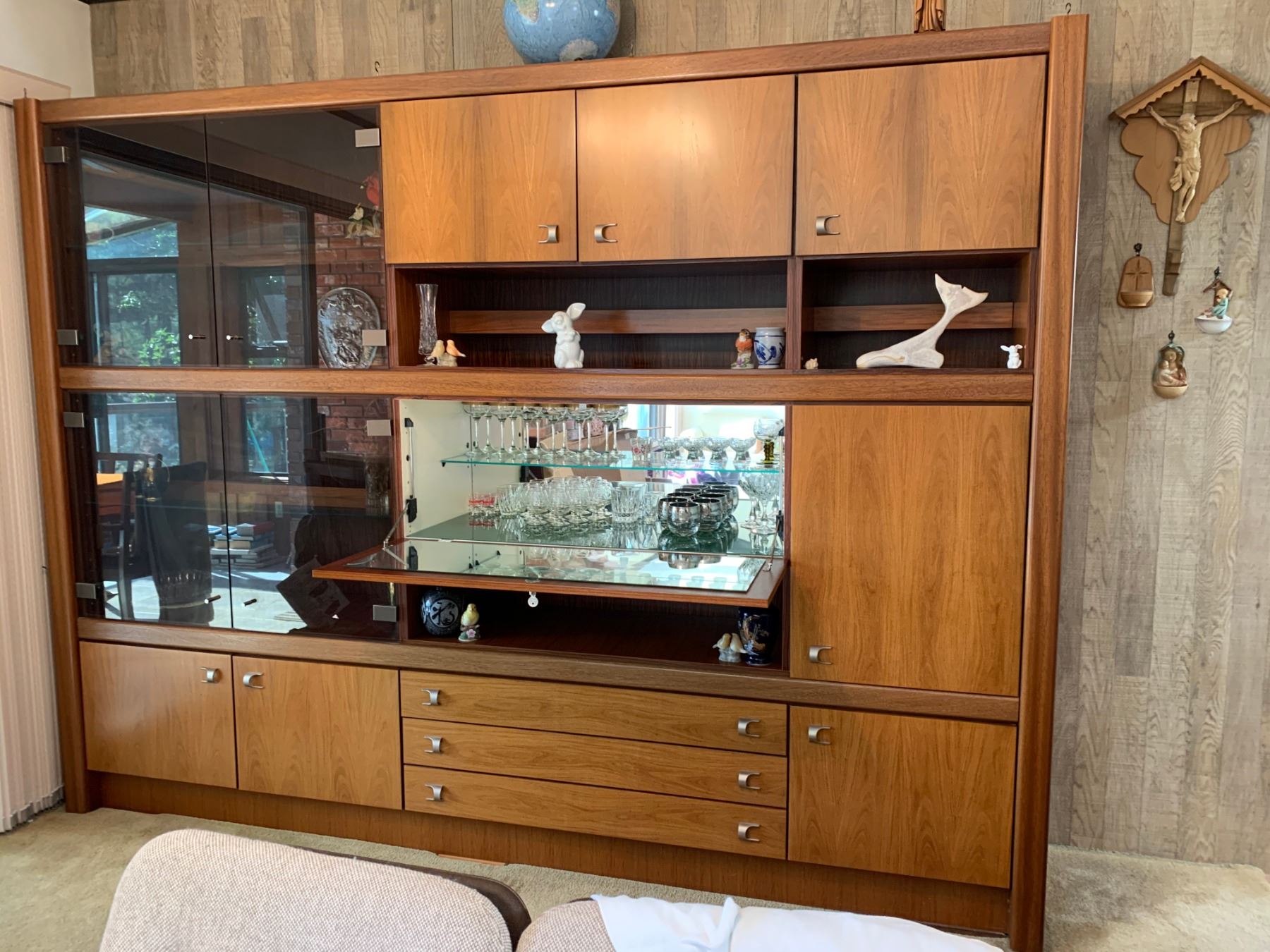 Three cabinets in the top row over open compartments wired for illumination, center row with three cabinets, the center with smoky glass doors, over three cabinets each with five drawers, raised on rectangular base, paper label, Bukenberger Mobel An-und aufbauwand Komet Beschlage type 345, Made in West Germany, ht. 88 1/4, dp. 17 1/4 in.