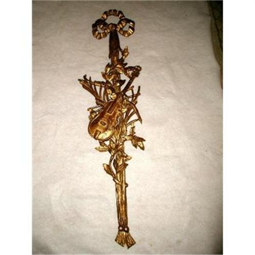 Italian gilt wall wood carving C.1920 depicts a long pair of tassels topped with a flowing ribbon and bow,tied at the ends. Midway,a violin nestled amongst branches and leaves. Hanger on back with wording "Italy". Excellent condition. A different and unique dressing for any wall. Measures 47.5H X 12.5L X 2D.