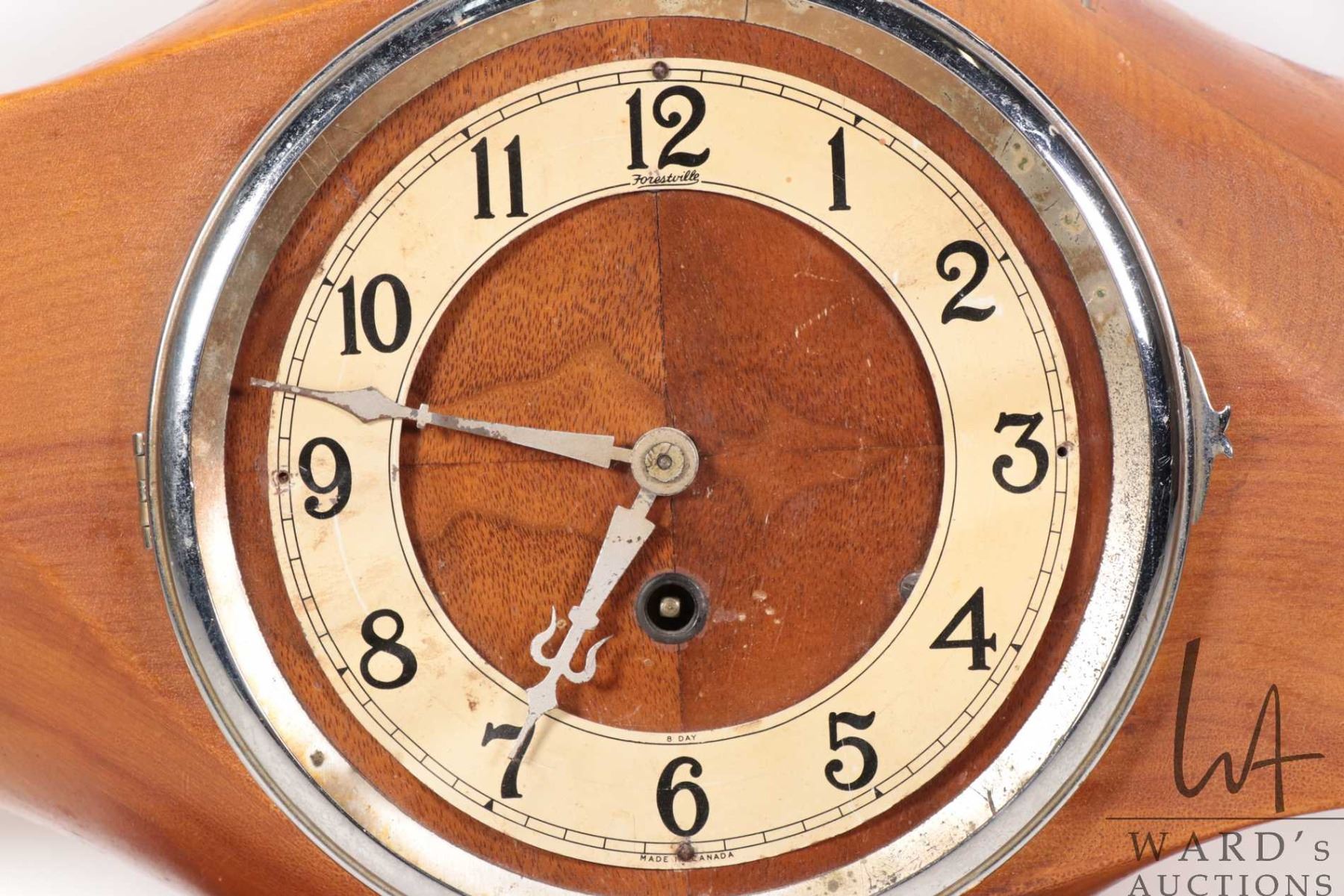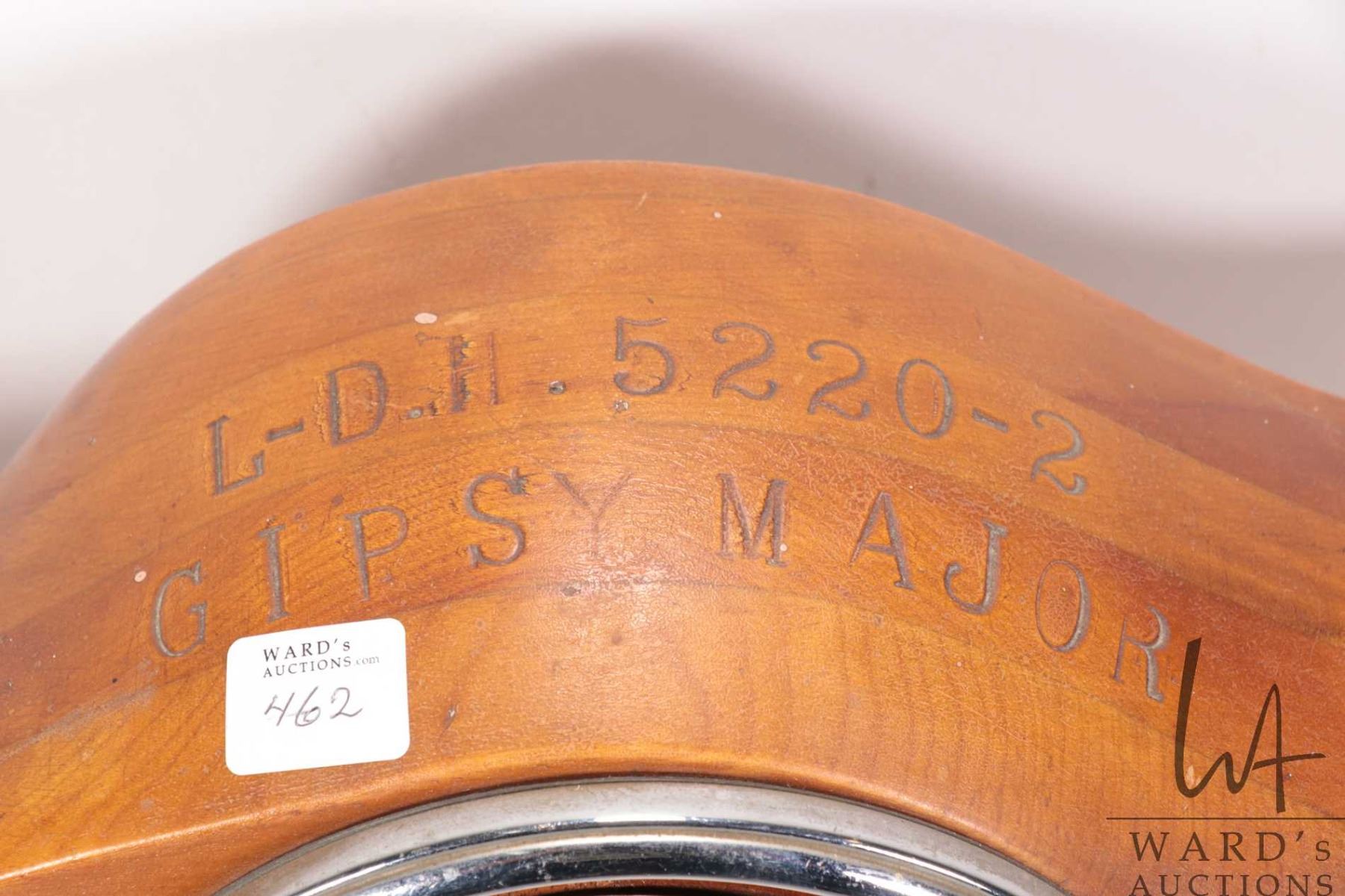 Wall clock fitted to a center section of a wooden propeller, marked Gypsy Major and labeled "FCAF", not working at time of cataloguing. Note: Not available for shipping. Local pickup only