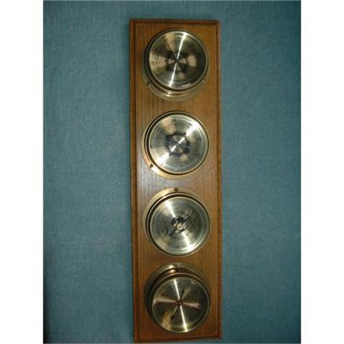 4 gauges mounted on a 21" x 6" wooden panel for wall hanging. The set consists of a heavy brass hygrometer, a thermoneter, a barometer & a clock, each 4.5"D x 2"H & w/heavy glass face. All in good working order.