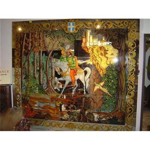 Fabulous painted hunting scene with guided paint from France. This is not something you will run across anytime soon. The mirror is meant to be fixed to a wall, and comes in 9 seperate pieces. Contact for more pictures.