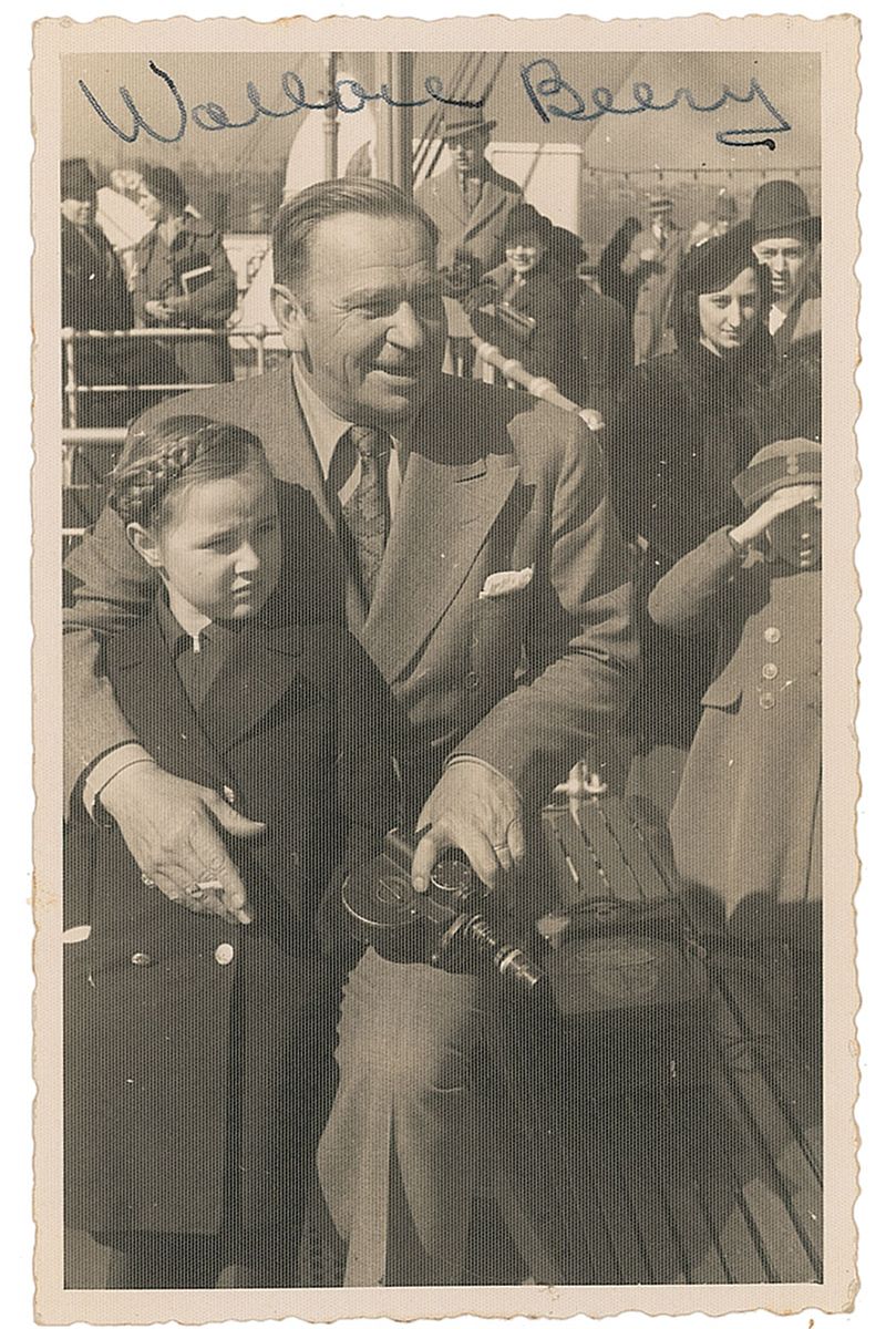 Vintage candid matte-finish 3.25 x 5.25 postcard photo of Beery on what appears to be a boat, signed at the top in fountain pen. In fine condition.