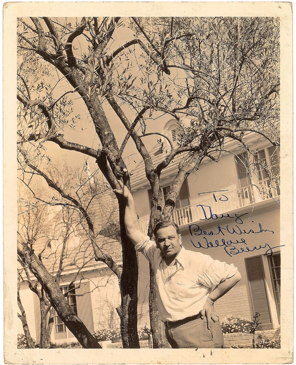 Vintage semi-glossy 8 x 10 photo of Beery leaning on a tree branch, signed and inscribed in black ink, “To Doug, Best Wishes, Wallace Beery.” Reverse bears an MGM photography credit stamp. In very good to fine condition, with creasing mainly confined to borders.