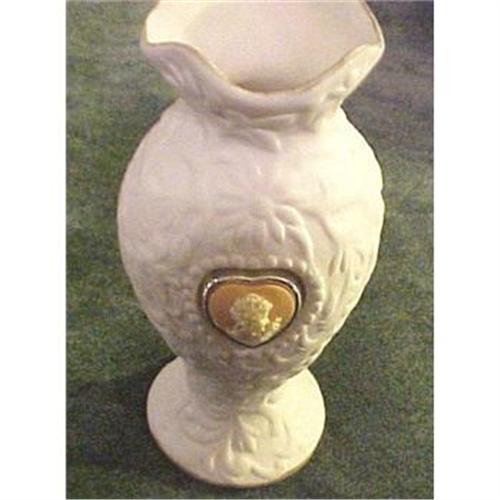 This is a porcelian vase with a peach colored cameo on the front. It is stampled Wallace Pottery on the bottom with a blue stamp. It is in good condition with no chips or cracks. It is about 5 1/2 inches tall and 2 1/2 inches in diameter at its widest point.