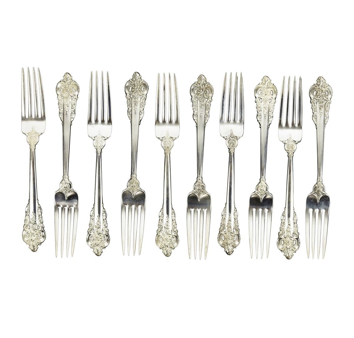 This listing is for a vintage set of Wallace Grande Baroque sterling silver forks, set of 10. They measure 7.5" long. They are in excellent vintage condition. There are no monograms on any of the forks. They are solid sterling silver. List price for a new grand baroque luncheon fork is $320/ea.