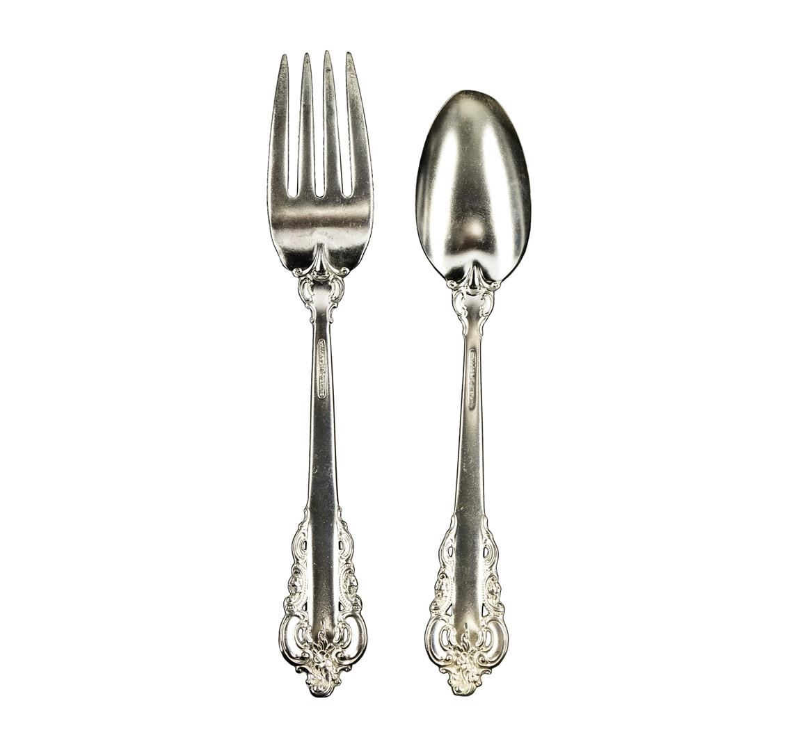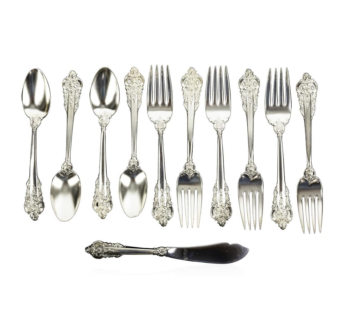 Wallace Grande Baroque sterling silver salad forks (6), teaspoons (4), master butter knife (1). This listing is for a vintage set of Wallace Grande Baroque sterling silver Salad forks, set of 6. They measure 6.5" long. They have a retail value of $320 each. The sterling silver teaspoons are a set of 4 measuring 6.25" long with a retail value of $210 each. The Master Butter knife has a stainless steel blade and sterling handle. It measures 6.5" long with a retail value of $140. . They are in excellent vintage condition. There are no monograms on any of the pieces.