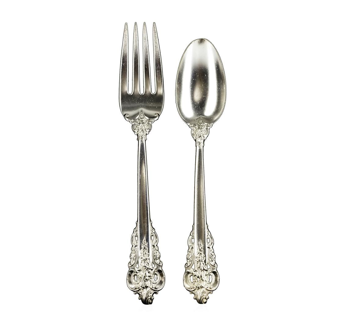Wallace Grande Baroque sterling silver salad forks (6), teaspoons (4), master butter knife (1). This listing is for a vintage set of Wallace Grande Baroque sterling silver Salad forks, set of 6. They measure 6.5" long. They have a retail value of $320 each. The sterling silver teaspoons are a set of 4 measuring 6.25" long with a retail value of $210 each. The Master Butter knife has a stainless steel blade and sterling handle. It measures 6.5" long with a retail value of $140. . They are in excellent vintage condition. There are no monograms on any of the pieces.