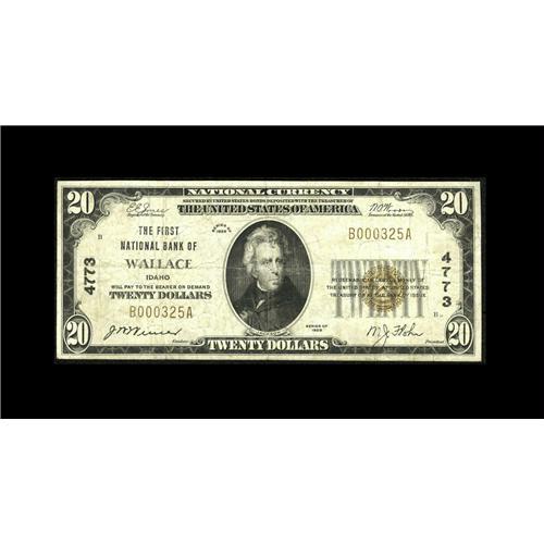 <B>Wallace, ID</B></I> - $20 1929 Ty. 1 <B>The First NB</B></I> Ch. # 4773<BR>An elusive bank with this $20 having sound edges. <B>Fine.</B></I>