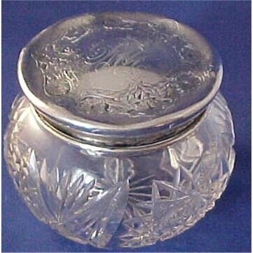 This is an unusually lovely sterling silver topped dresser jar by Wallace. The top features an intricate floral pattern that I believe is morning glories. The inside of the top appears to be gold washed. There is also a fancy intertwined monogram. The jar is cut crystal and magnificent as well! There is a minor edge ding on the top, but this piece is otherwise in great condition.It measures 3 1/4" tall and about 4" across.