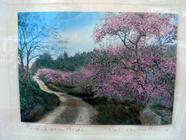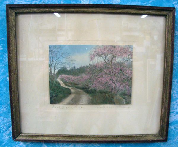 Wallace Nutting Hand Tinted Photo Original Frame. This tinted photo is titled, ''Decked as a Bride'' and is signed by Wallace. It is in its original wood frame and has some warping and stains from moisture. The visual measures 5''x6.5''. Nutting (1861-1941) lived in New England and was an accomplished photographer, artist, and furniture maker among other things as well as a minister.