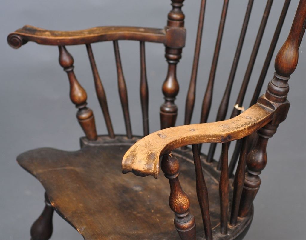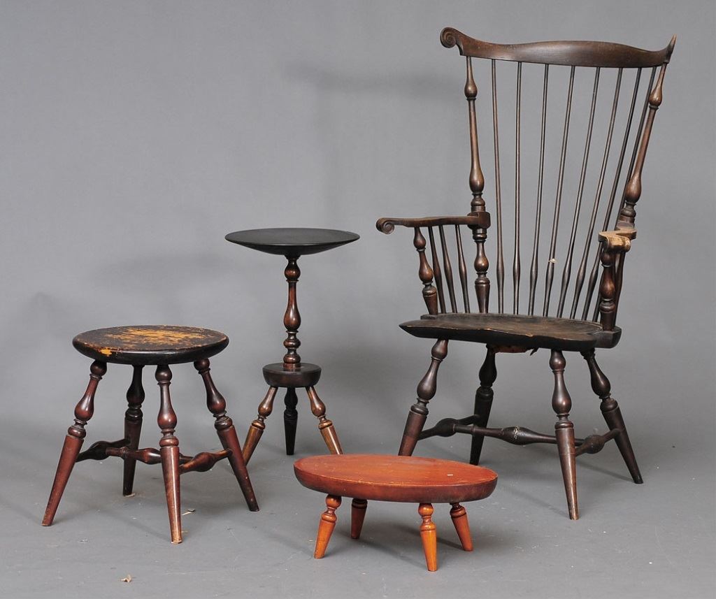 CONDITION REPORT: finish wear to tall stool and arms of Windsor, chip to edge of stand