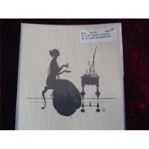 This is an authentic 7" x 8" W. N. Silhouette. Wallace Nutting introduced silhouettes in 1927. An assistant, Ernest John Donnelly (EJD), drew more than 30 different silhouettes. These silhouettes are machine produced copies of the original-pen type hand-done drawings by "EJD." Silhouettes of women typically have only one woman in them and represent both interior and exterior scenes. They are always marked in one of the three ways. Some have the "EDJ" in a circle, "(C) WN," and some carry both. Occasionally, the mark will be cropped off to fit a picture frame. There were at least 22 different WOMAN silhouettes. Please see other silhouettes including Mr. & Mrs. Nutting, Mother's Day, Christmas & Greeting Cards. NOTE: USPS FIRST CLASS SHIPPING & INSURANCE (USA) - $2.00. (H)