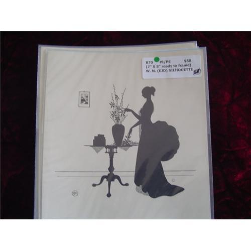 This is an authentic 7" x 8" W. N. Silhouette. Wallace Nutting introduced silhouettes in 1927. An assistant, Ernest John Donnelly (EJD), drew more than 30 different silhouettes. These silhouettes are machine produced copies of the original-pen type hand-done drawings by "EJD." Silhouettes of women typically have only one woman in them and represent both interior and exterior scenes. They are always marked in one of the three ways. Some have the "EDJ" in a circle, "(C) WN," and some carry both. Occasionally, the mark will be cropped off to fit a picture frame. There were at least 22 different WOMAN silhouettes. Please see other silhouettes including Mr. & Mrs. Nutting, Mother's Day, Christmas & Greeting Cards. NOTE: USPS FIRST CLASS SHIPPING & INSURANCE (USA) - $2.00. (H)