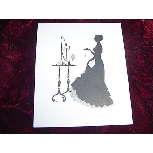 This is an authentic 3" x 4" W. N. Silhouette. Wallace Nutting introduced silhouettes in 1927. An assistant, Ernest John Donnelly (EJD), drew more than 30 different silhouettes. These silhouettes are machine produced copies of the original-pen type hand-done drawings by "EJD." Silhouettes of women typically have only one woman in them and represent both interior and exterior scenes. They are always marked in one of the three ways. Some have the "EDJ" in a circle, "(c) WN," and some carry both. Occasionally, the mark will be cropped off to fit a picture frame. There are at 22 different WOMEN silhouettes in this size (3" x 4"). Please see other silhouettes including Mr. & Mrs. Nutting, Mother's Day, Christmas & Greeting Cards. NOTE: USPS FIRST CLASS SHIPPING & INSURANCE (USA) - $2.00. (H)