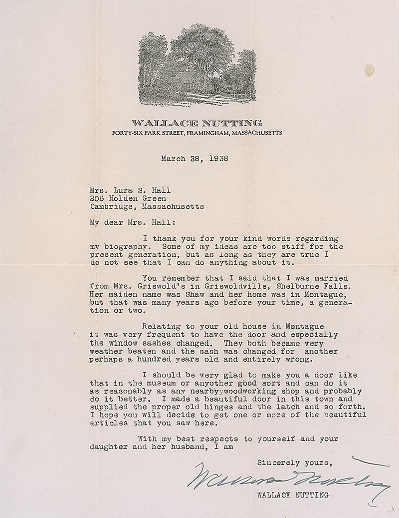 Minister, artist, and antiquarian (1861–1941) known primarily for his scenic, hand-colored photographs. TLS, one page, 8.25 x 11, illustrated personal letterhead, March 28, 1938. Letter to Lura S. Hall. In part: “Some of my ideas are too stiff for the present generation, but as long as they are true I do not see that I can do anything about it…I should be very glad to make you a door like that in the museum or any other good sort and can do it as reasonably as any nearby woodworking shop and probably do it better.” Intersecting folds, one vertical fold passing through a single letter of the signature, and a spot of adhesive to the upper right, otherwise fine condition. Accompanied by the original mailing envelope.