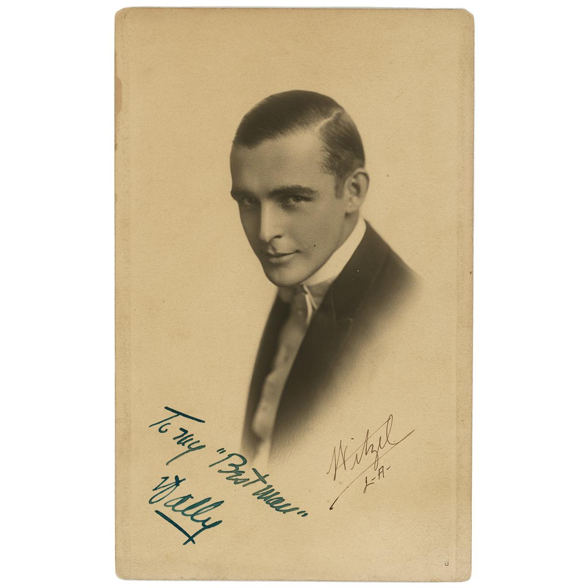 Handsome silent screen actor/director who died in 1923 at the age of 31 as a result of alcohol addiction and a morphine habit instigated by the studio Famous Players. He appeared in over one hundred films, most notably Birth of a Nation. Splendid vintage 5 x 8 Witzel portrait, signed and inscribed in fountain pen “To my ‘Best Man,’ Wally.” In fine condition, with a tack hole at the lower right corner, and a small stain to left edge