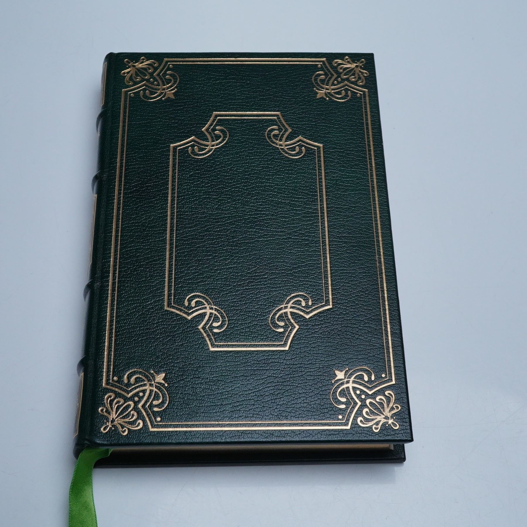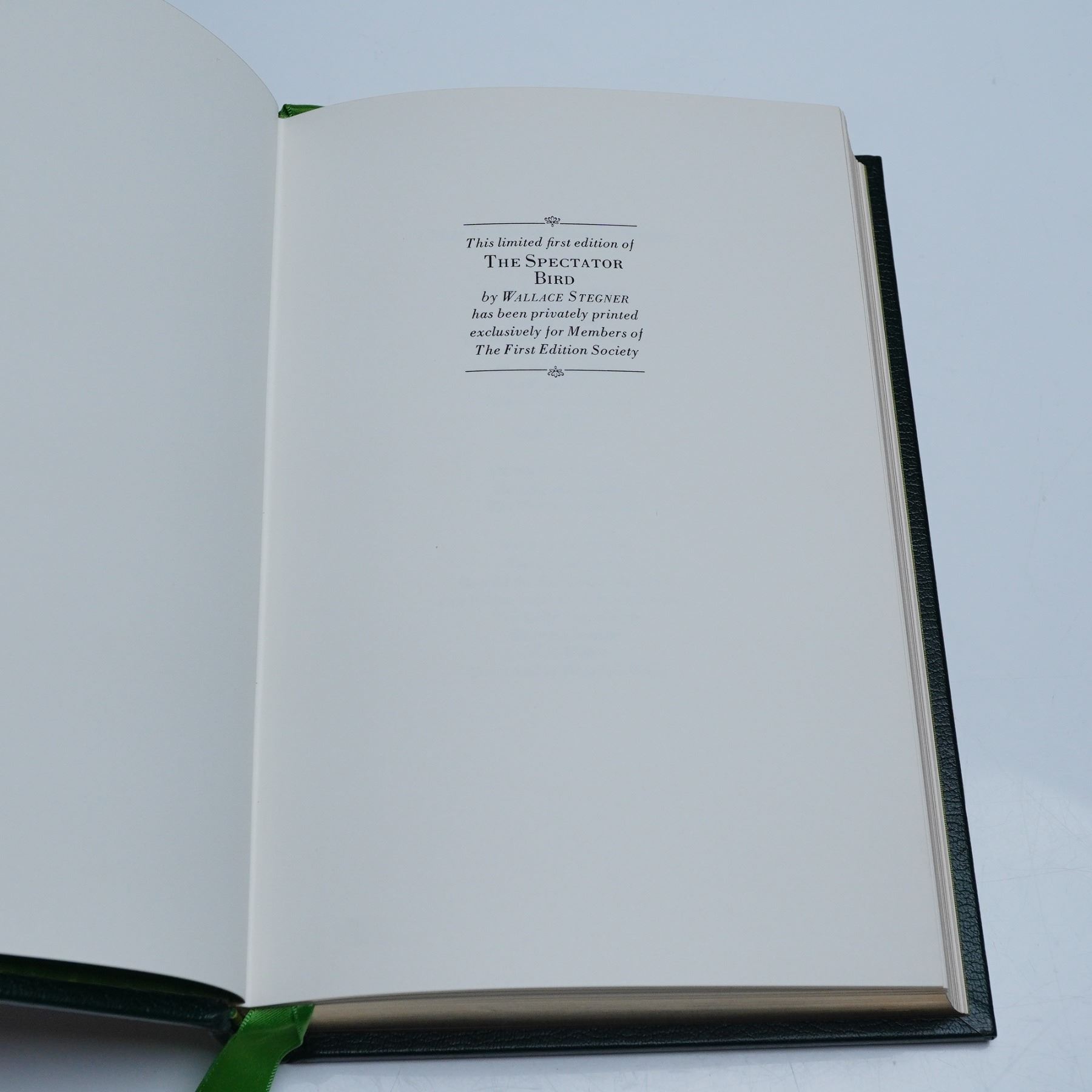 Franklin Library First Edition Society printing of The Spectator Bird by Wallace Stegner, privately published in 1976 at Franklin Center, Pennsylvania. Bound in deep green leather with decorative gilt tooling on the front, back, and spine, this collector's edition features hubbed spine bands, moire endpapers, a bright green satin ribbon bookmark, and gilt page edges. Printed on archival-quality paper exclusively for members of the First Edition Society. Measures 6.25"L x 9.25"H. 267 pages.