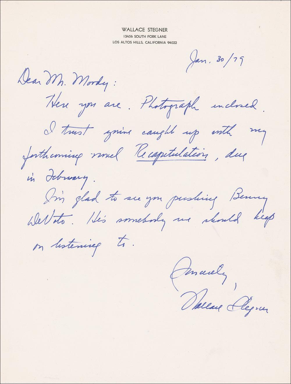 Pulitzer Prize-winning author (1909-1993). ALS, one page, 8.5 x 11, personal letterhead, January 30, 1979. Short letter to Mr. Mordy. In part: “I’ve trust you caught up with my forthcoming novel Recapitulation, due in February. I’m glad to see you are pushing Benny DeVoto. He’s somebody we should keep on listening to.” In fine condition.