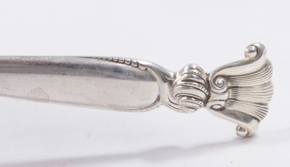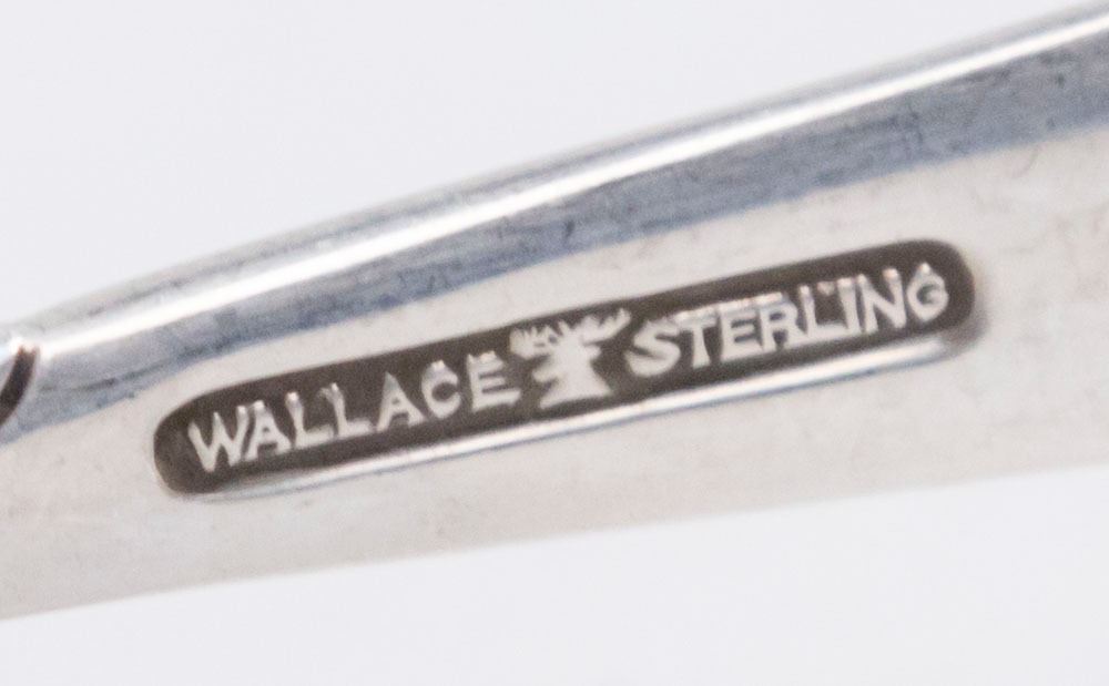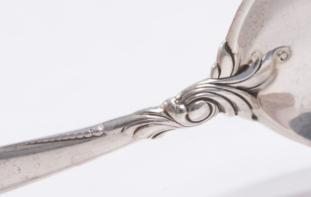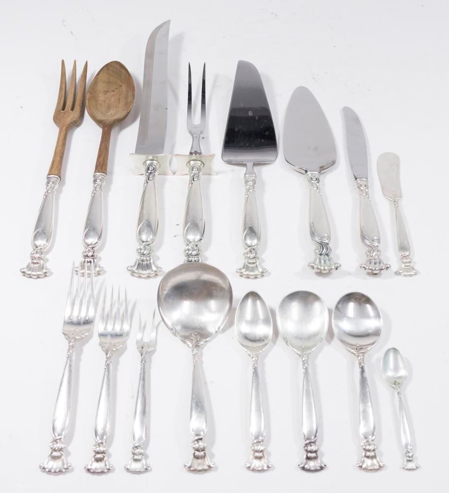 Including: 12 knives, bullion, dinner forks, demitasse, teaspoons, luncheon forks, 8 solid butter pats, meat fork & knife, salad fork & spoon, one cheese spread, one small ladle, one relish, one cake spread, one sugar spoon. Total of 89 pieces. Approx. 107ozt. (6170)