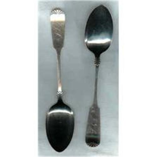 Made by R. Wallace in the "Figured Tipped" pattern 1880. 8.1/4" long, Monogram is"JYJ" (I think) Normal wear scratches. Two serving Spoons.