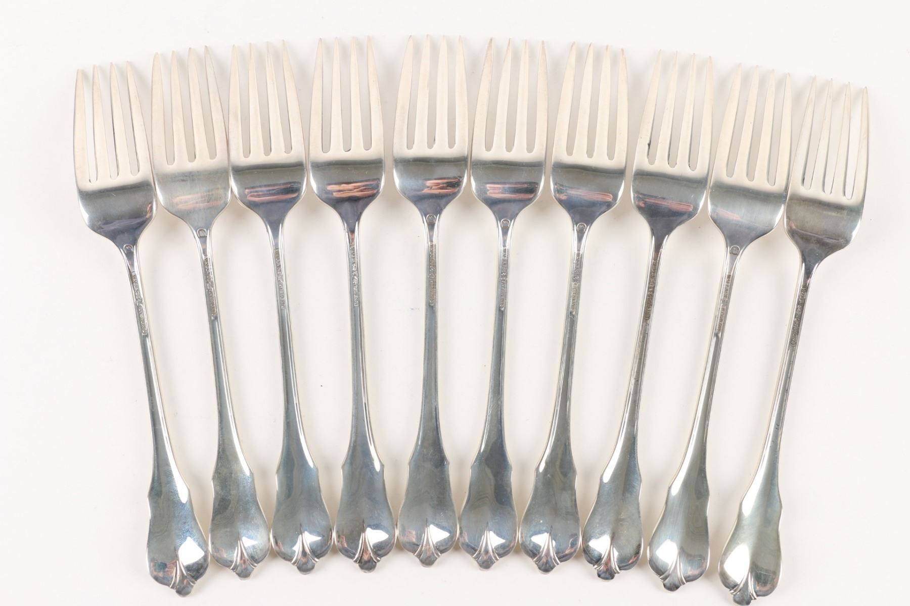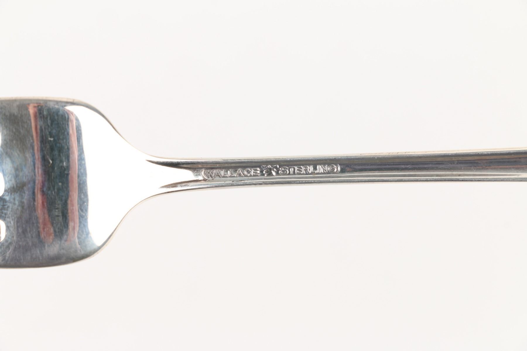 Lot 361 - Fifty-seven (57) pieces. Each piece marked "Wallace - Sterling". 5.5" to 9". Gross weight forks and knives, 1340g, knives 1204g (Sterling handles). $1300-1500.