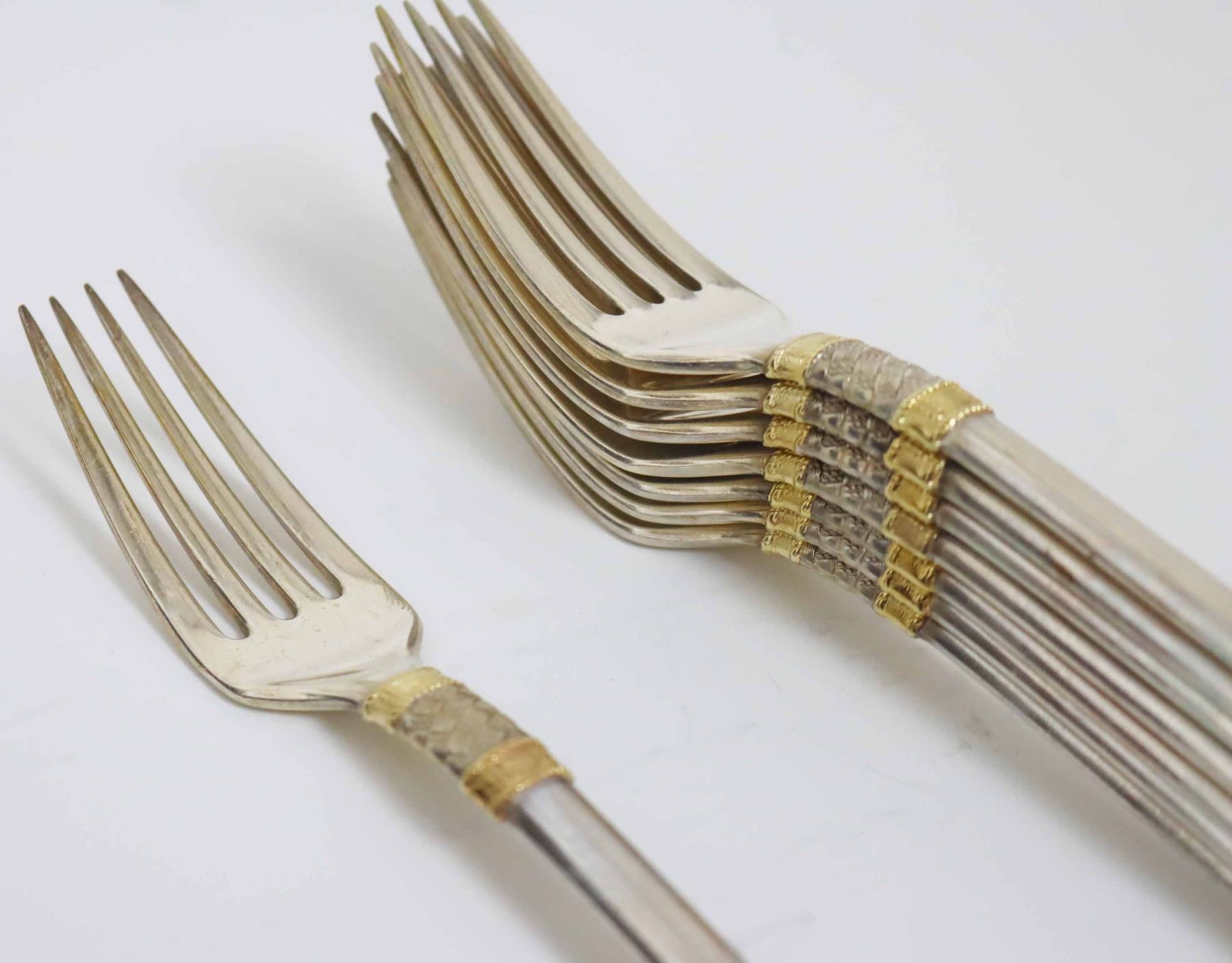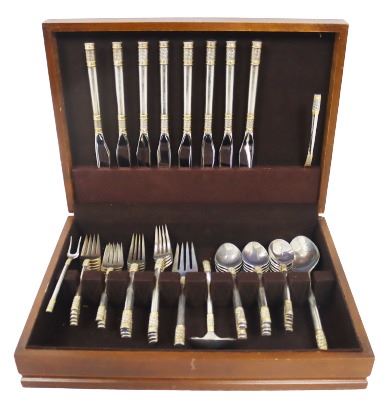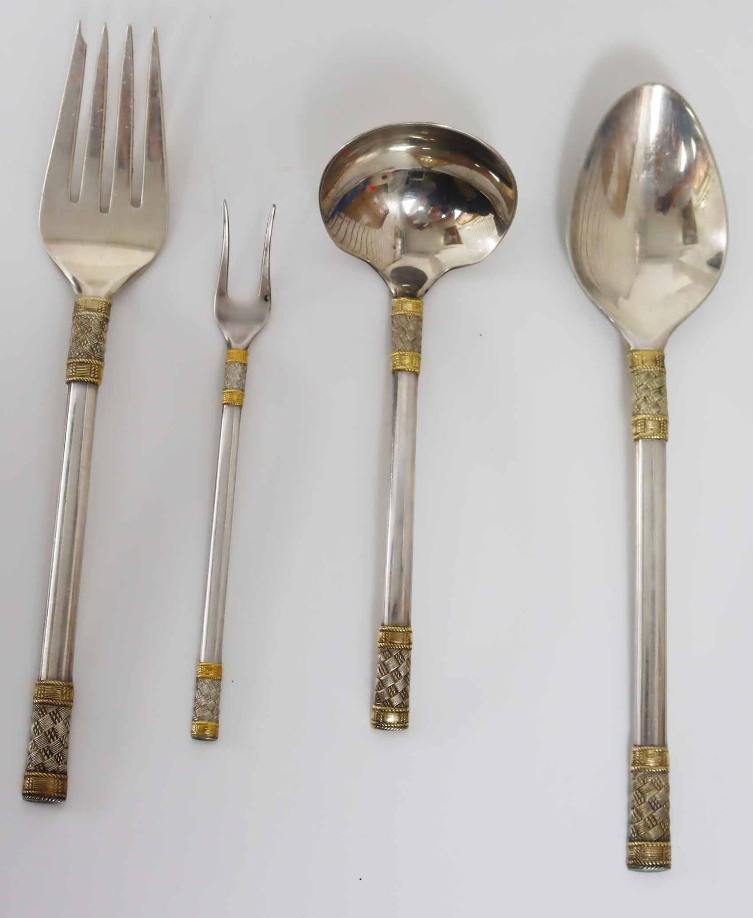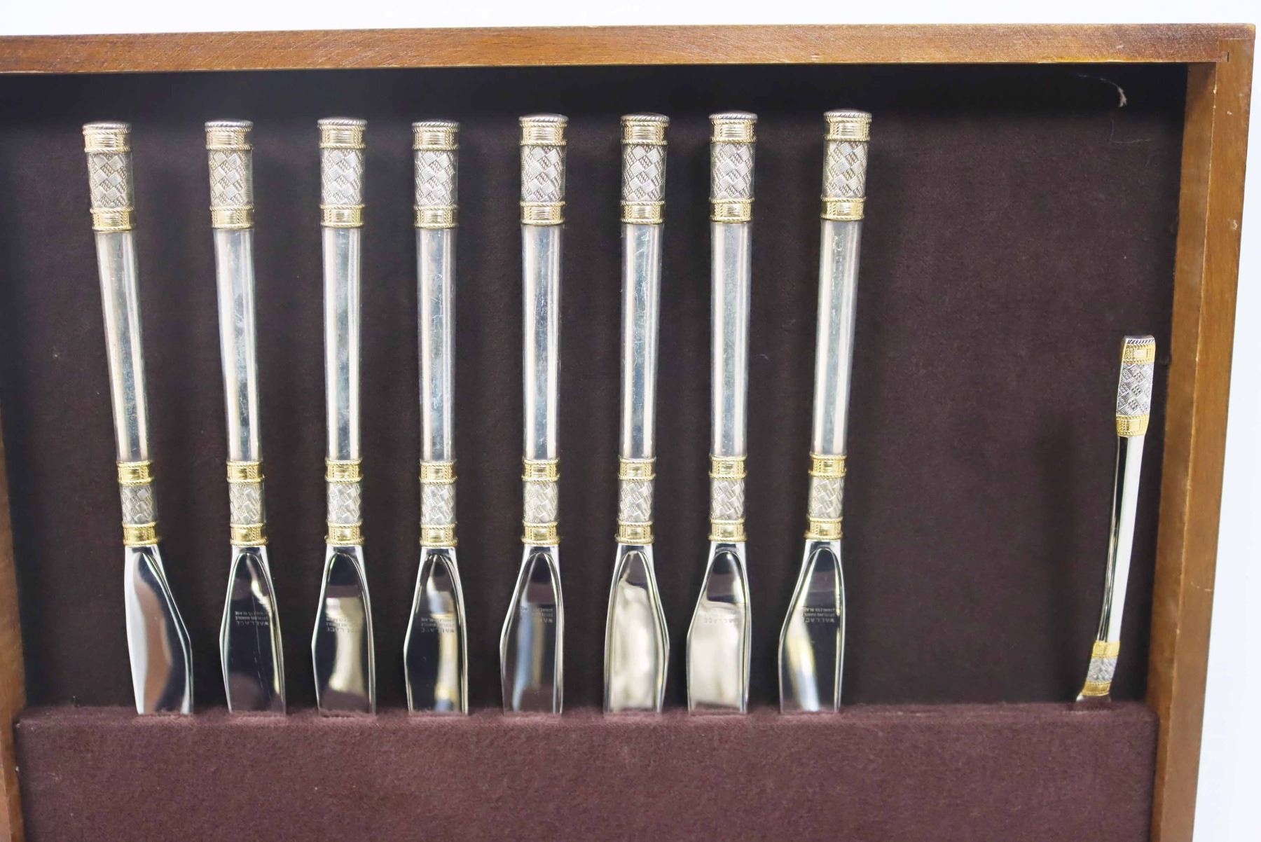 Wallace sterling silverware set, marked sterling. Knives are sterling handle and stainless blades. "Golden Aegean Weave" by Wallace. Approx 60 OZT.