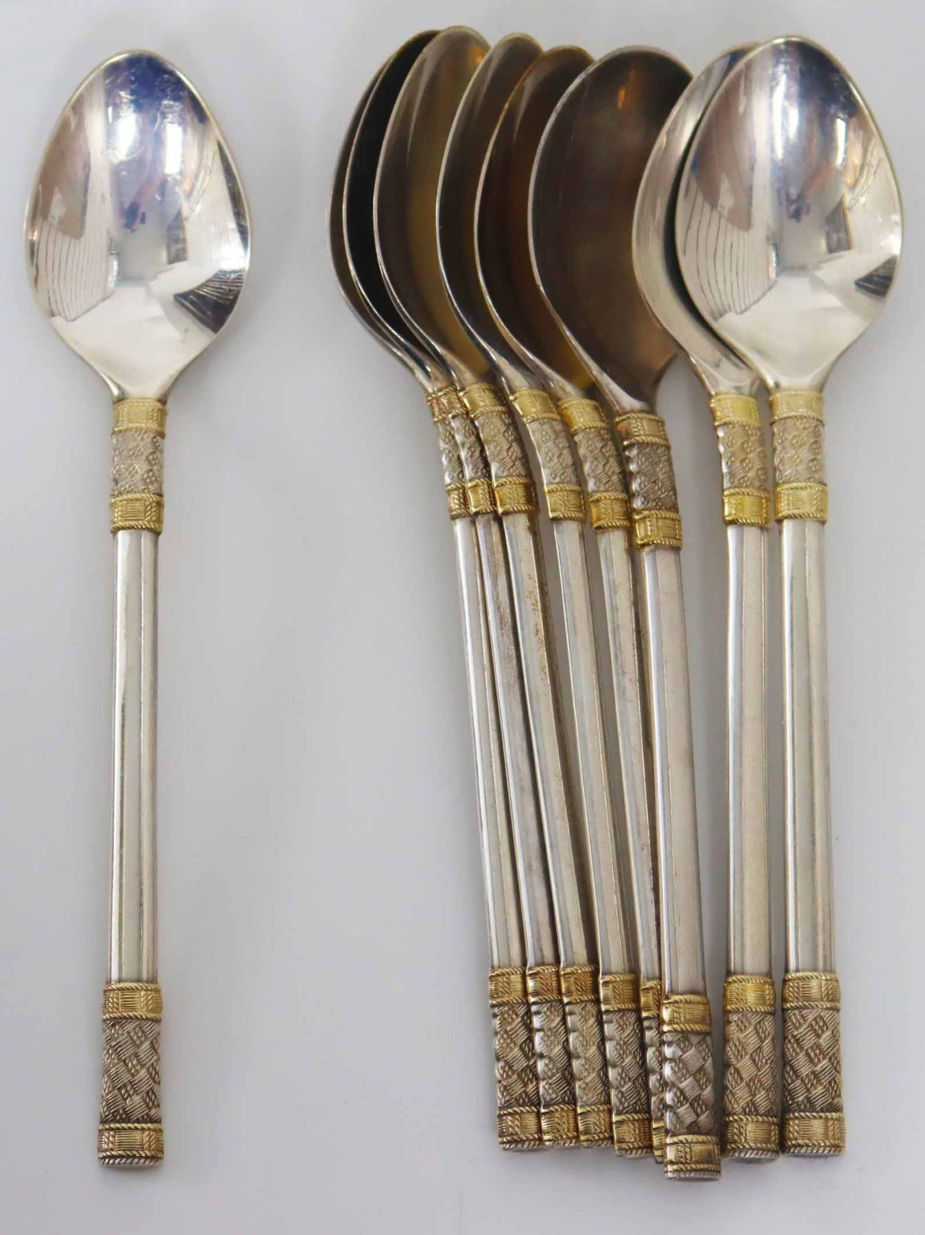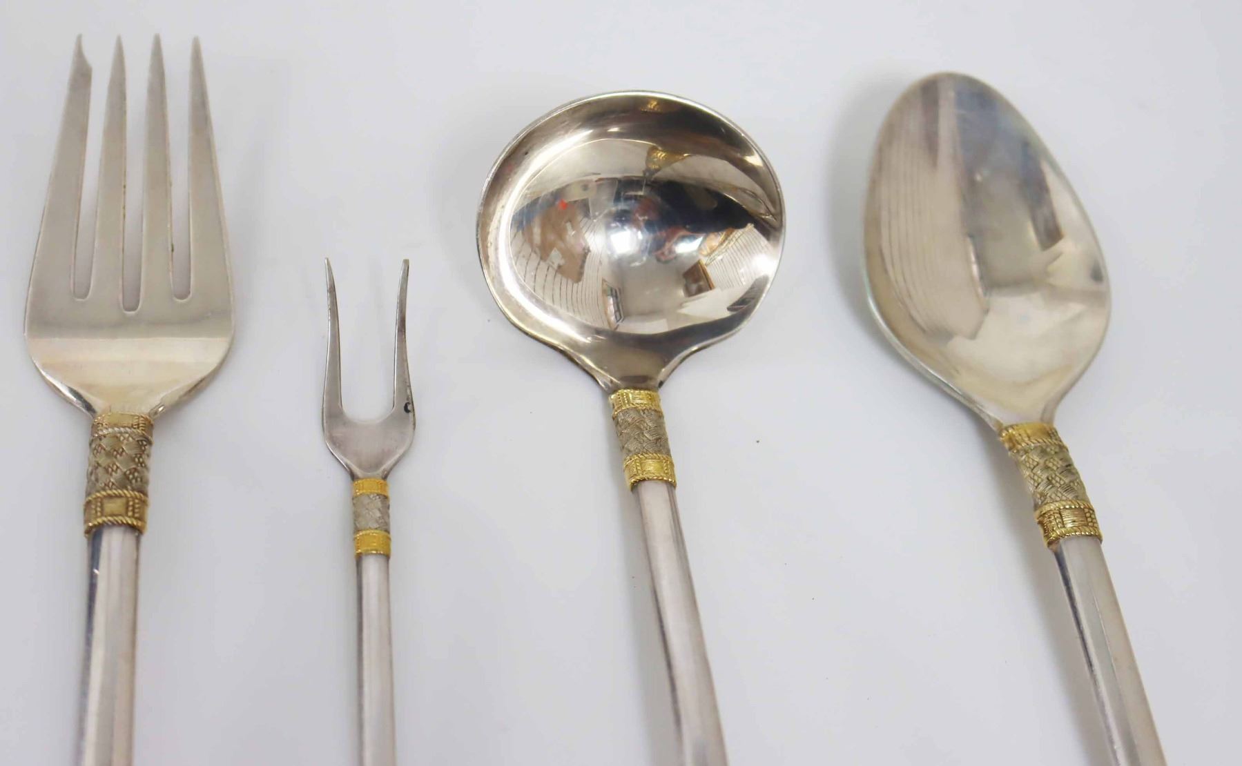 1 big spoon, 1 wide spoon, 9 long spoons, 8 shorter spoons, 1 big fork, 2 prong forks, 8 long forks, 8 short prong forks, 8 knives, 1 small knife.