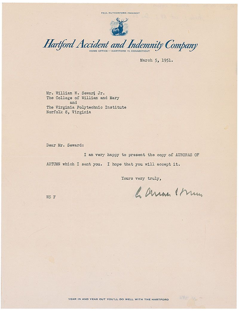Pulitzer Prize–winning poet (1879–1955) whose works include ‘Valley Candle,’ and ‘The Emperor of Ice-Cream.’ Scarce TLS, one page, 8.5 x 11, Hartford Accident and Indemnity Company letterhead, March 5, 1951. Short letter to William Seward at The College of William and Mary. In full: “I am very happy to present the copy of Auroras of Autumn which I sent you. I hope that you will accept it.” In fine condition, with intersecting folds, one through a single letter of signature, and a bit of scattered light toning.