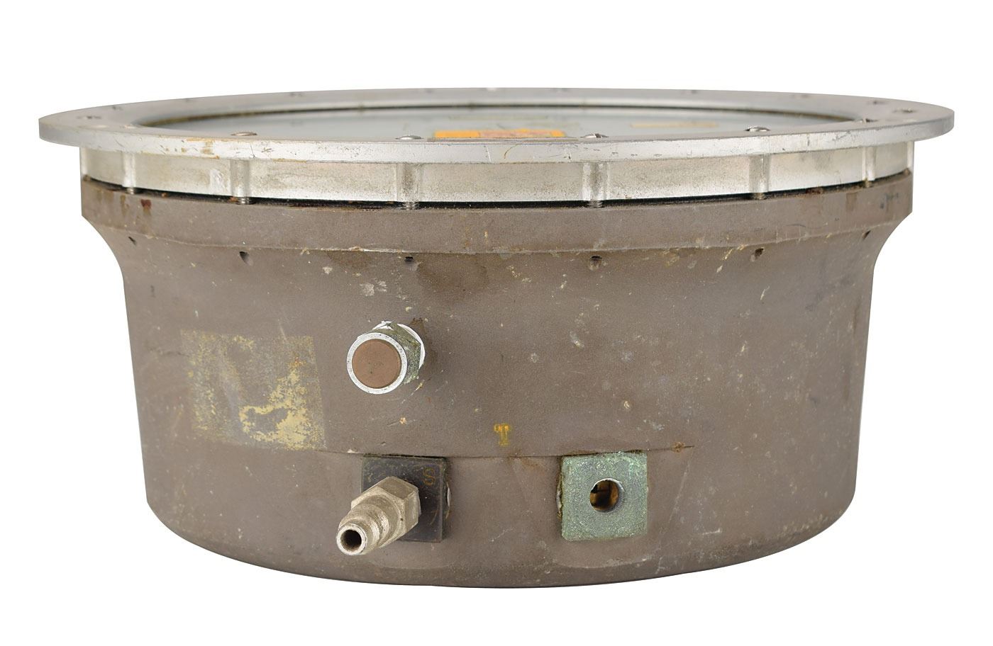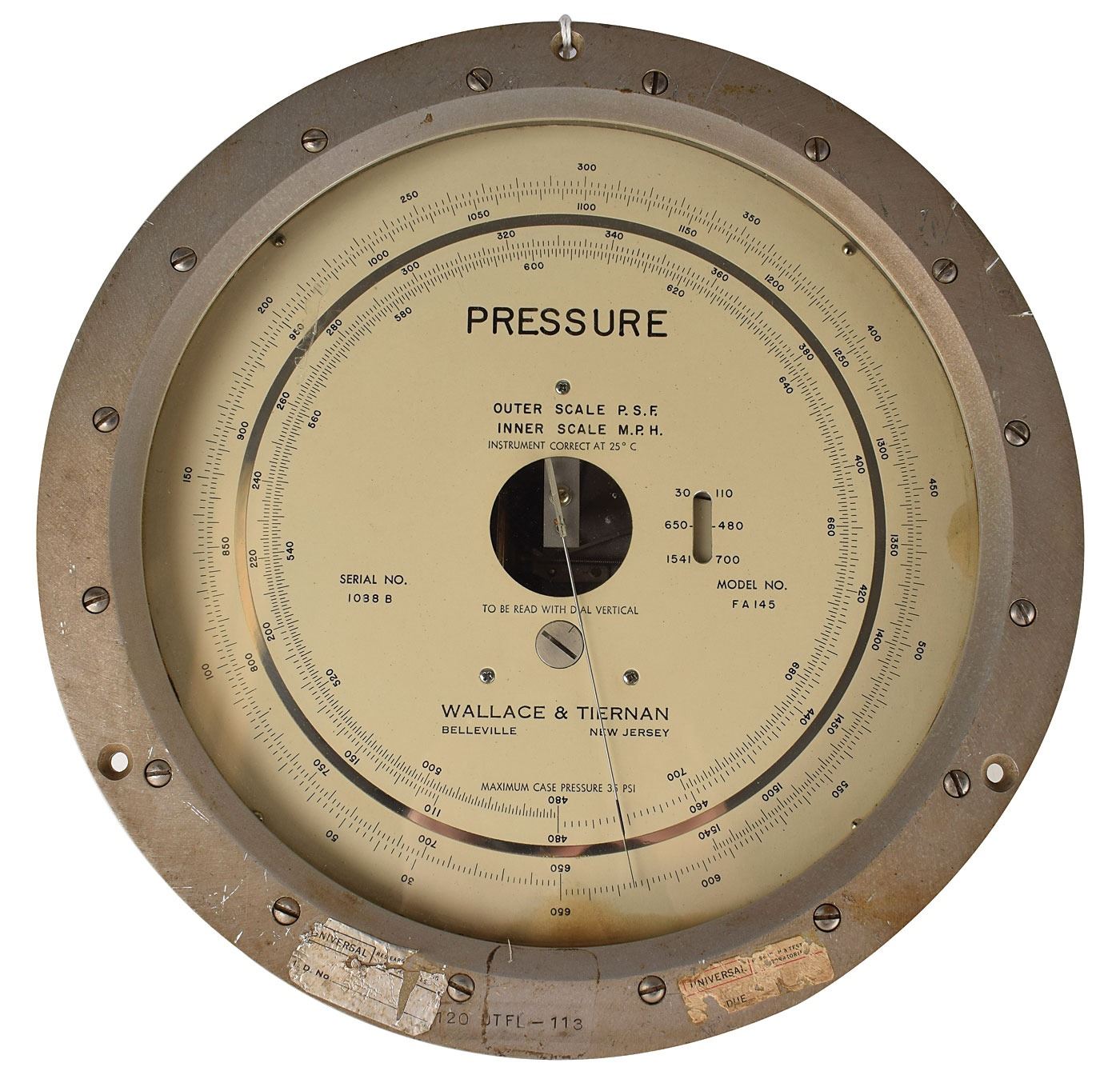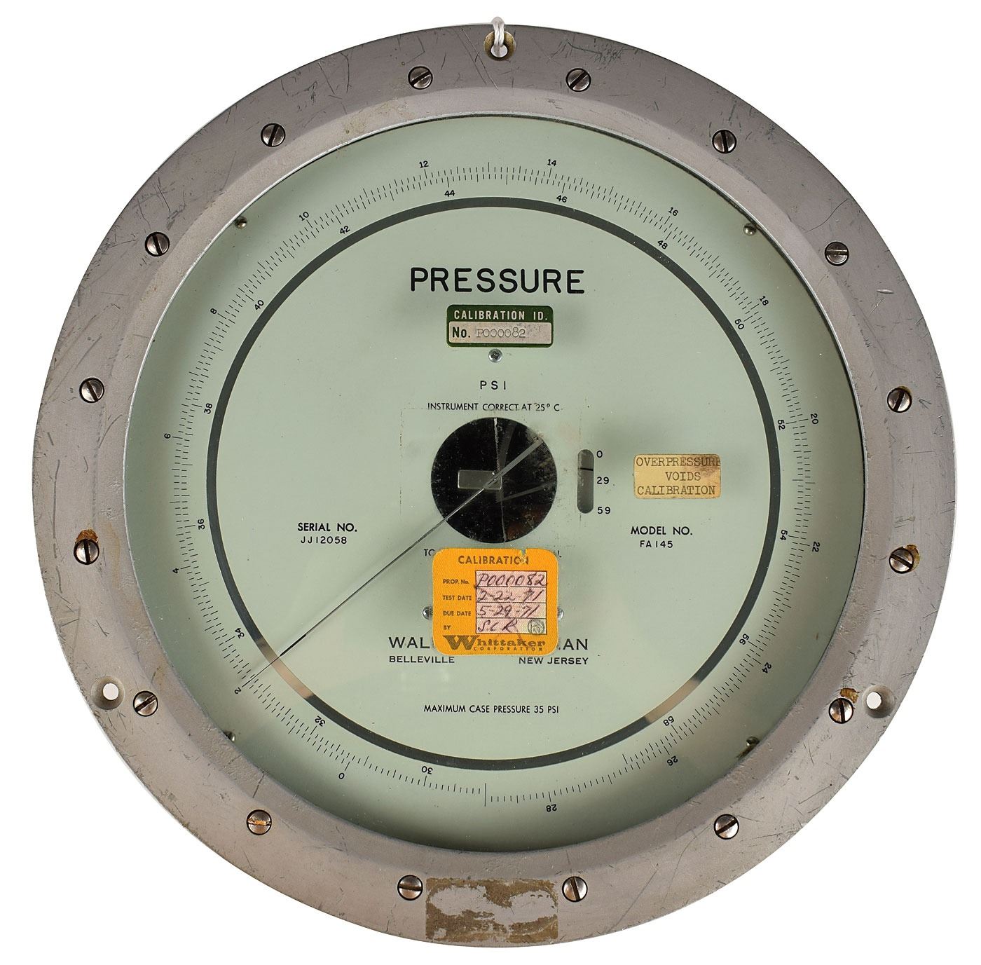 Pair of two large Wallace & Tiernan Model FA145 high precision pressure gauges, each measuring 10? in diameter and 5? tall, with one marked as "Serial No. 1088 B" and the other (with a blue-hued glass face) as "Serial No. JJ12058." Both bear various affixed inspection and calibration labels. In overall very good to fine condition.