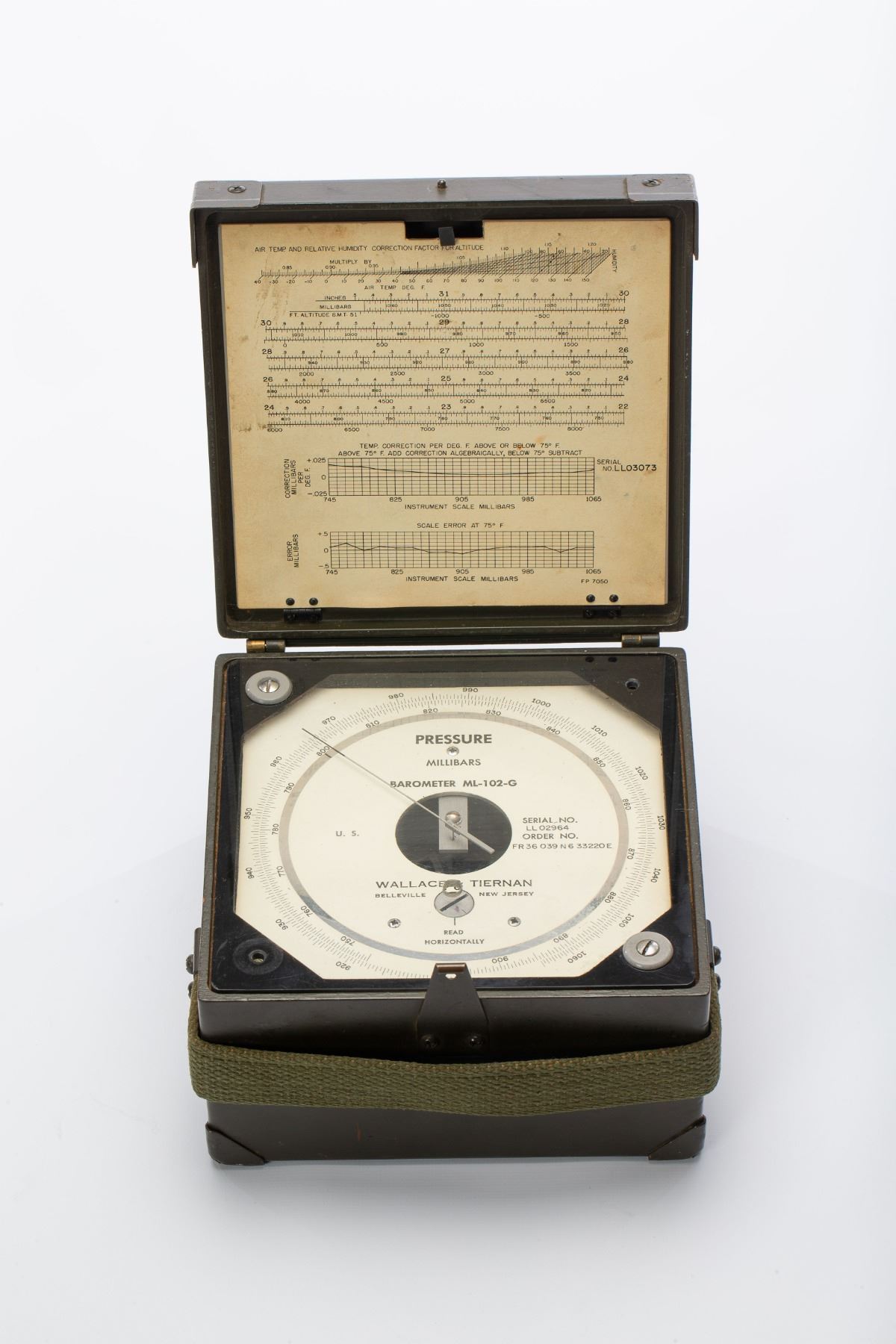 Precision barometer manufactured by Wallace & Tiernan of Belleville, New Jersey, housed in a 6.25? x 6.25? x 4? case with correction factor charts inside the lid. The face is marked: "Barometer ML-102-G, Serial No. LL02964, Order No. FR36 039 N6 33220E." In fine condition.