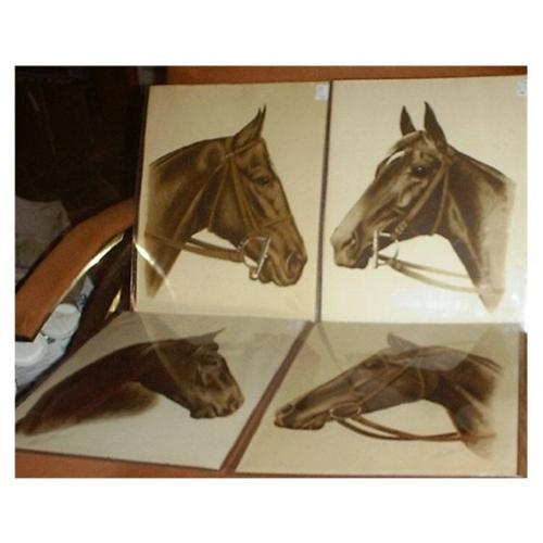 1940-1950's. Set of four(4) Sepia tone lithographs of either Thoroughbreds or possibly famous race horses. All are Hand signed in pencil, at the bottem of each image, by Wallace, the artist.<p>In very good condition. Some yellowing, one watermark, a few nicks at the very edge of pictures (which will not be seen when matted and framed).<p>Measurements are: 14" tall by 11" wide.<p>Four magnificant horseheads in beautiful shades of brown on off white backgrounds. The detail and shading of the Horse Head studies show the touch of a real master who understood the Horse. Three horses are wearing English bits and bridles. Two horses are facing right and two horses are facing left.<p>These matched horsehead lithographs make a noble and elegant statement, and would dress up any room in your house, stable or business.