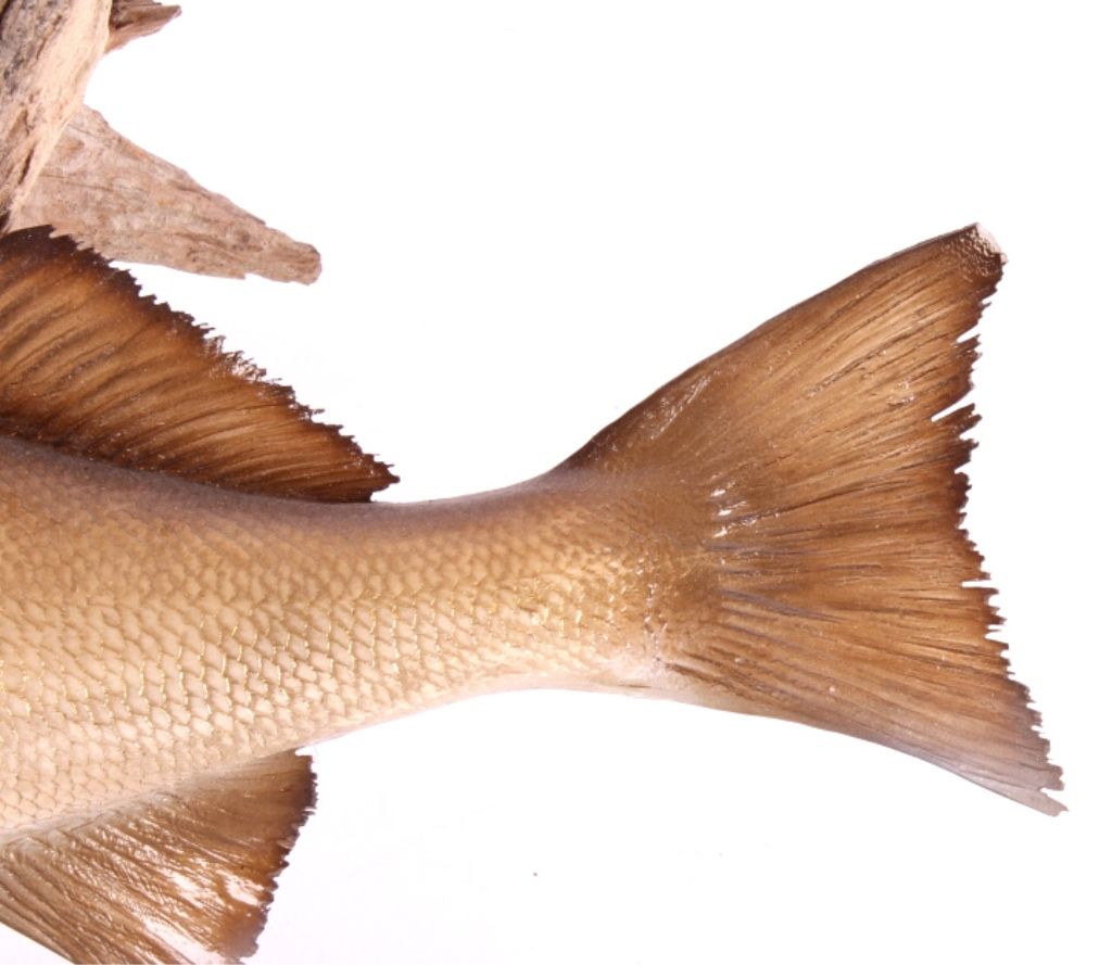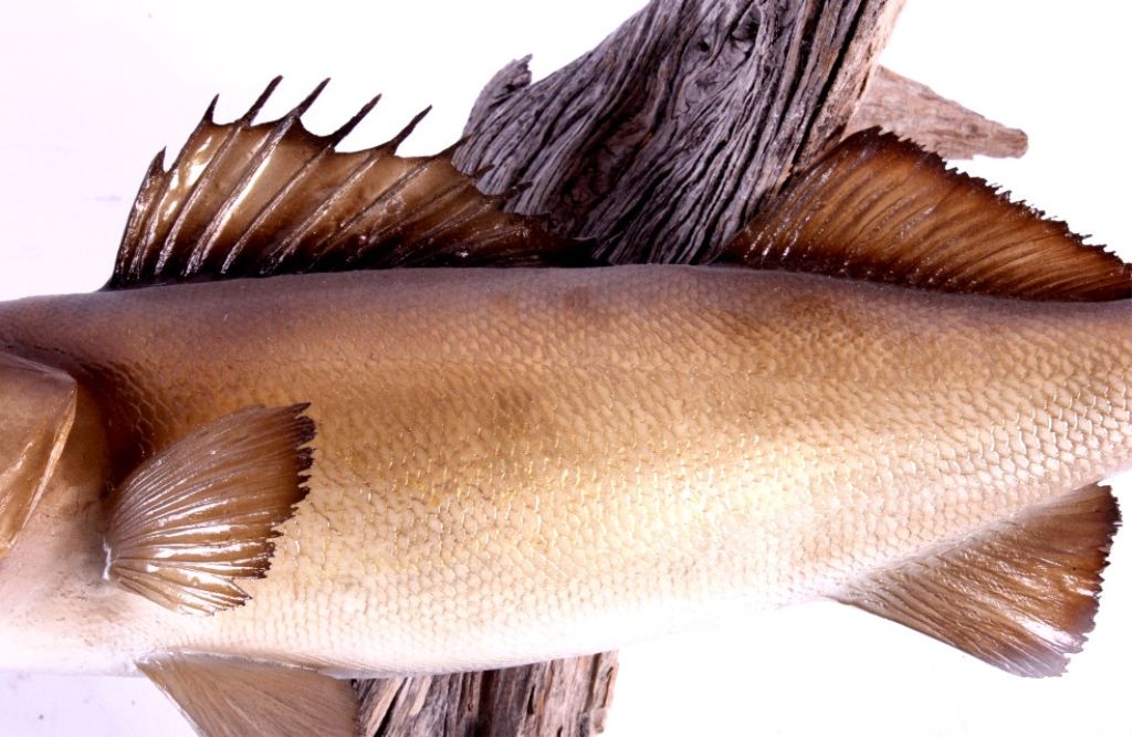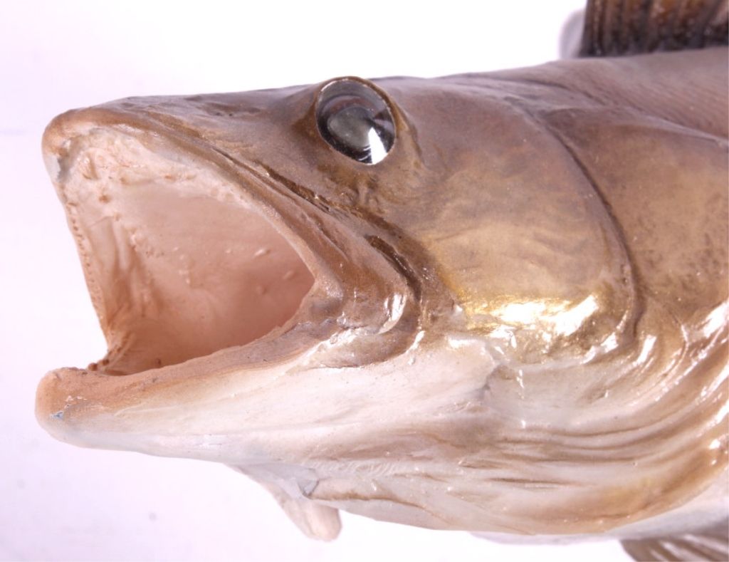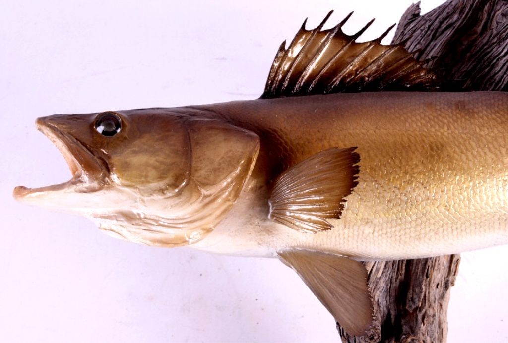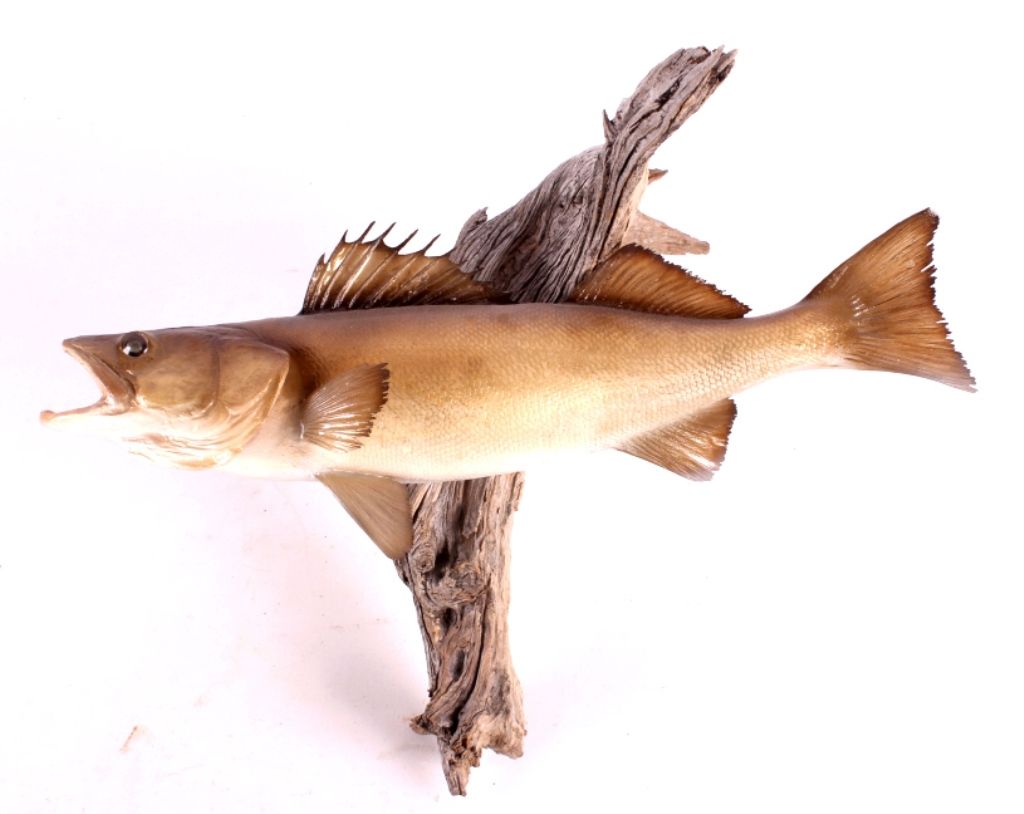 This is a walleye mount. It was prepared by a professional taxidermist. It shows good color with the fish in a striking position. It is mounted to a piece of driftwood. The walleye mount is in good condition. The fish measures 22" long.