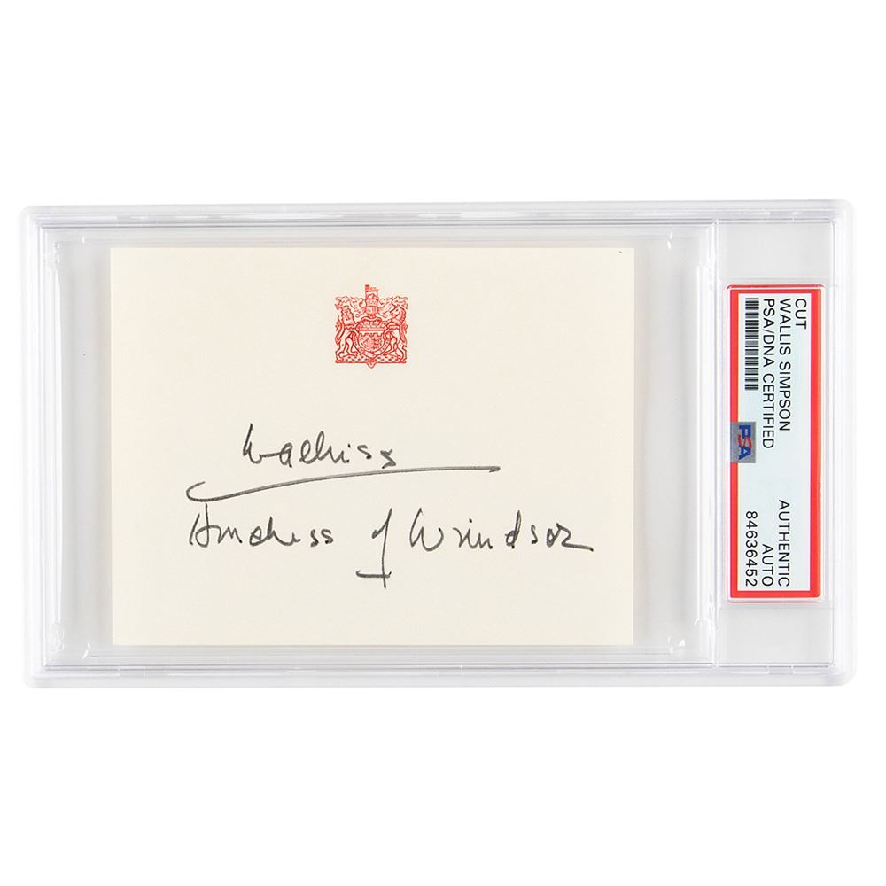 Felt tip signature, "Wallis, Duchess of Windsor,†on an off-white 4.5 x 3.5 card imprinted with her coat-of-arms. In very fine condition. Encapsulated in a PSA/DNA authentication holder.