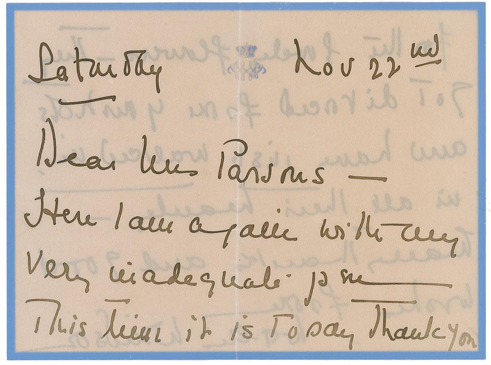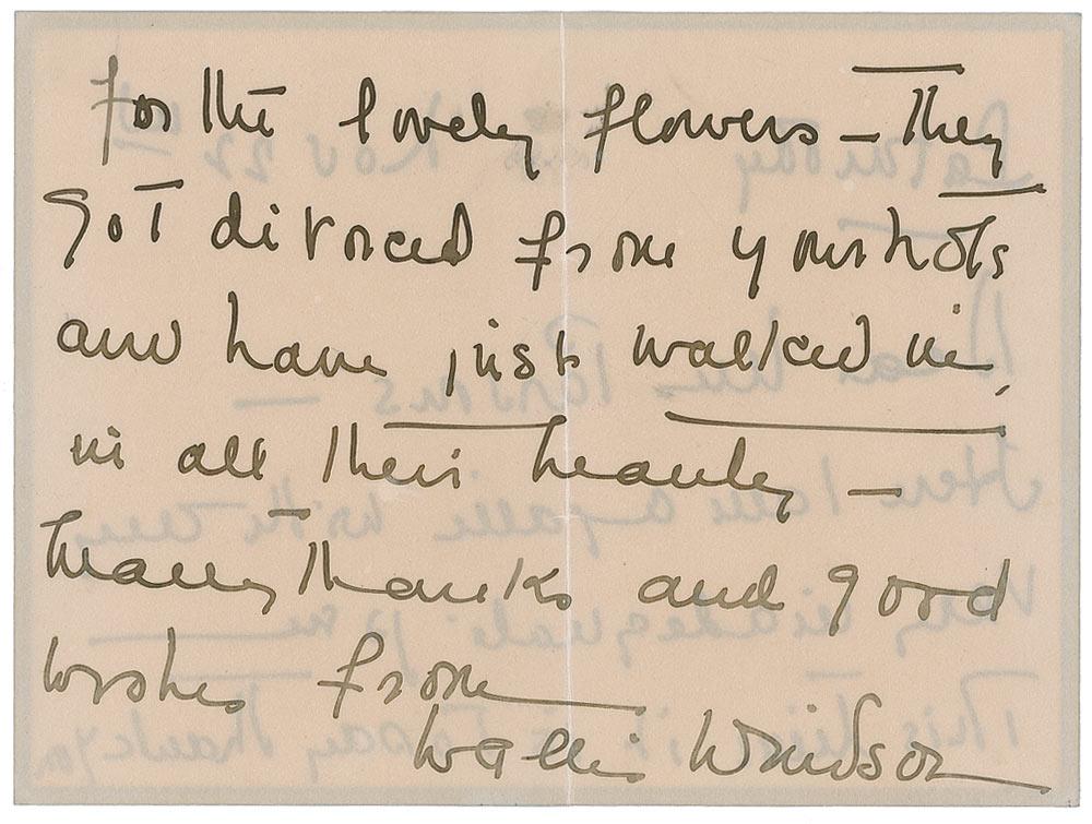 ALS signed “Wallis Windsor,” one page both sides, 6 x 4.5, November 22. Letter of thanks to Louella Parsons. In full: “Here I am again with my very inadequate pen. This time it is to say thank you for the lovely flowers—They got divorced from your note and have just walked in, in all their beauty.” In fine condition, with a central vertical fold and a uniform shade of mild toning. As one of the first US gossip columnists, Parsons worked for William Randolph Hearst for many years. Mr. Hearst was attempting to promote Wallis as a suitable ‘American Queen’ prior to the abdication. Miss Parsons covered the Windsor wedding for Hearst publications and continued a cordial relationship with the Duchess.