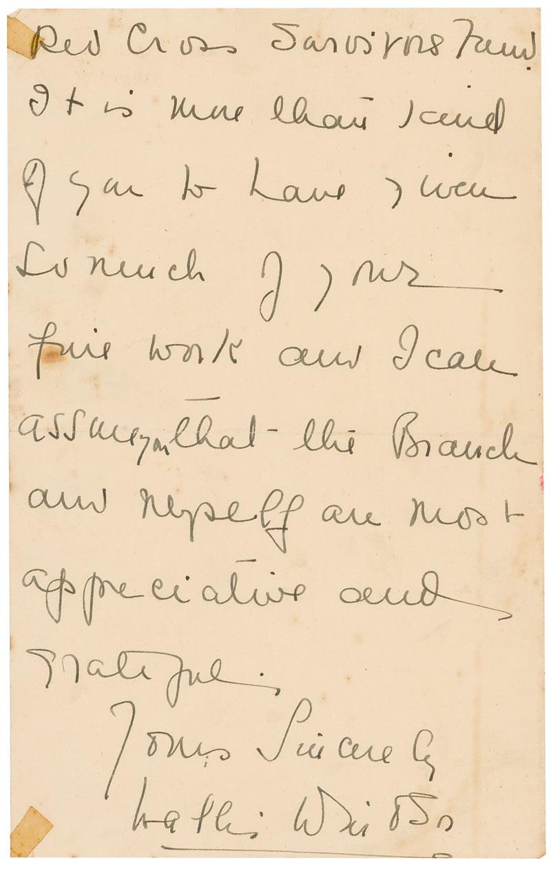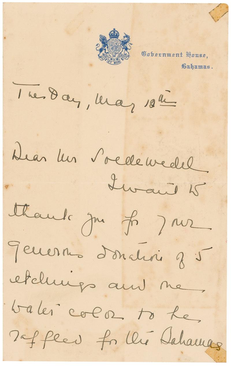 ALS signed “Wallis Windsor,” two pages on two adjoining sheets, 5 x 8, Government House letterhead, March 12. Letter sending thanks for a donation of etchings and a watercolor. In part: “I want to thank you for your generous donation of 5 etchings and one watercolor to the raffle for the Bahamas Red Cross Survivors Fund. It is more than kind of you to give so much of your fine work.” In very good condition, with scattered toning and foxing, tape remnants to edges, and a few light creases.