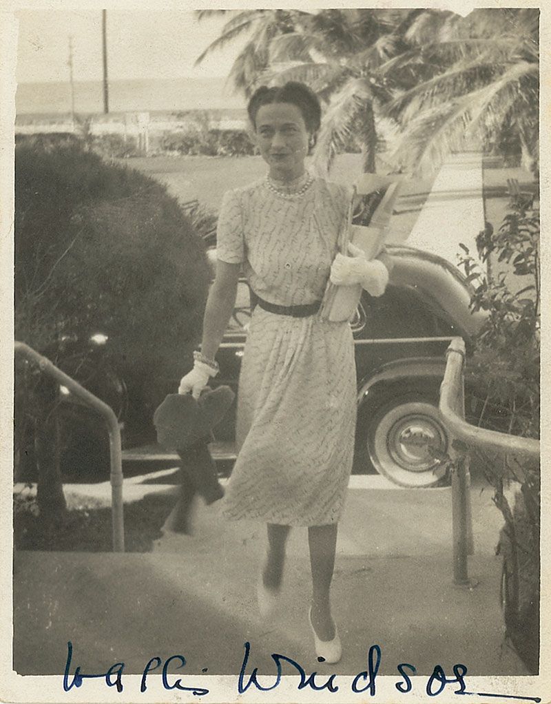 Vintage matte-finish 3.75 x 4.75 photo of Wallis walking up a stairway from a city street, signed along the bottom in fountain pen, “Wallis Windsor.” In fine condition.